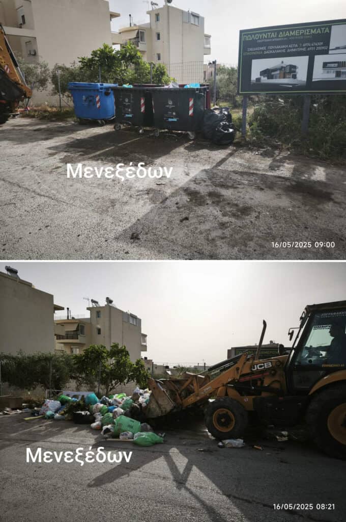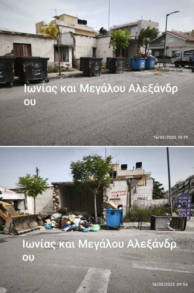 Σήμερα Δευτέρα 19/5 αναμένεται να πραγματοποιηθεί η απομάκρυνση των υπολοίπων ογκωδών και των απορριμμάτων στις οδούς Σωκράτη, Εμμ. Ξηρουχάκη, Δημητρίου Γληνού και στη συμβολή των οδών Παρασκευοπούλου και Μεγάλου Αλεξάνδρου, σημεία που λόγω της κάλυψης των χιλιομετρικών ορίων κίνησης των μηχανημάτων δεν ολοκληρώθηκαν.