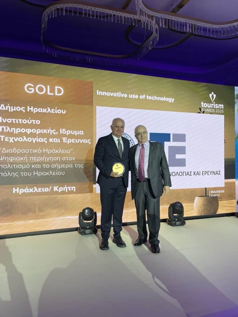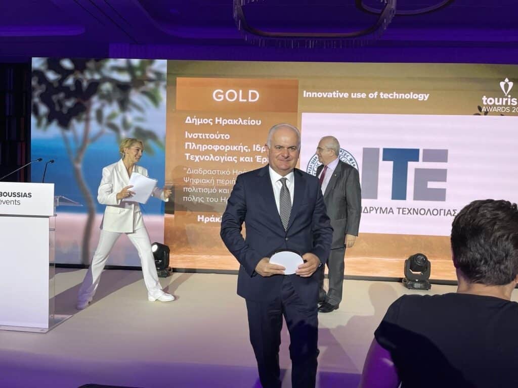 Συγκεκριμένα, το πρώτο Χρυσό Βραβείο απονεμήθηκε στην κατηγορία “Innovative Use of Technology” για το έργο “Διαδραστικό Ηράκλειο: Μια εμπειρία ψηφιακής περιήγησης στον πολιτισμό και το σήμερα”, το οποίο δημιουργήθηκε σε συνεργασία με το Ίδρυμα Τεχνολογίας και Έρευνας (ΙΤΕ) και το Ινστιτούτο Πληροφορικής. Το έργο αξιοποιεί τις πλέον σύγχρονες ψηφιακές τεχνολογίες για να προσφέρει στους επισκέπτες μια μοναδική και διαδραστική εμπειρία γνωριμίας με τον πολιτισμό και την ιστορία του Ηρακλείου. Το έργο το οποίο είναι διαθέσιμο στην ηλεκτρονική διεύθυνση https://heraklion360.eu/.