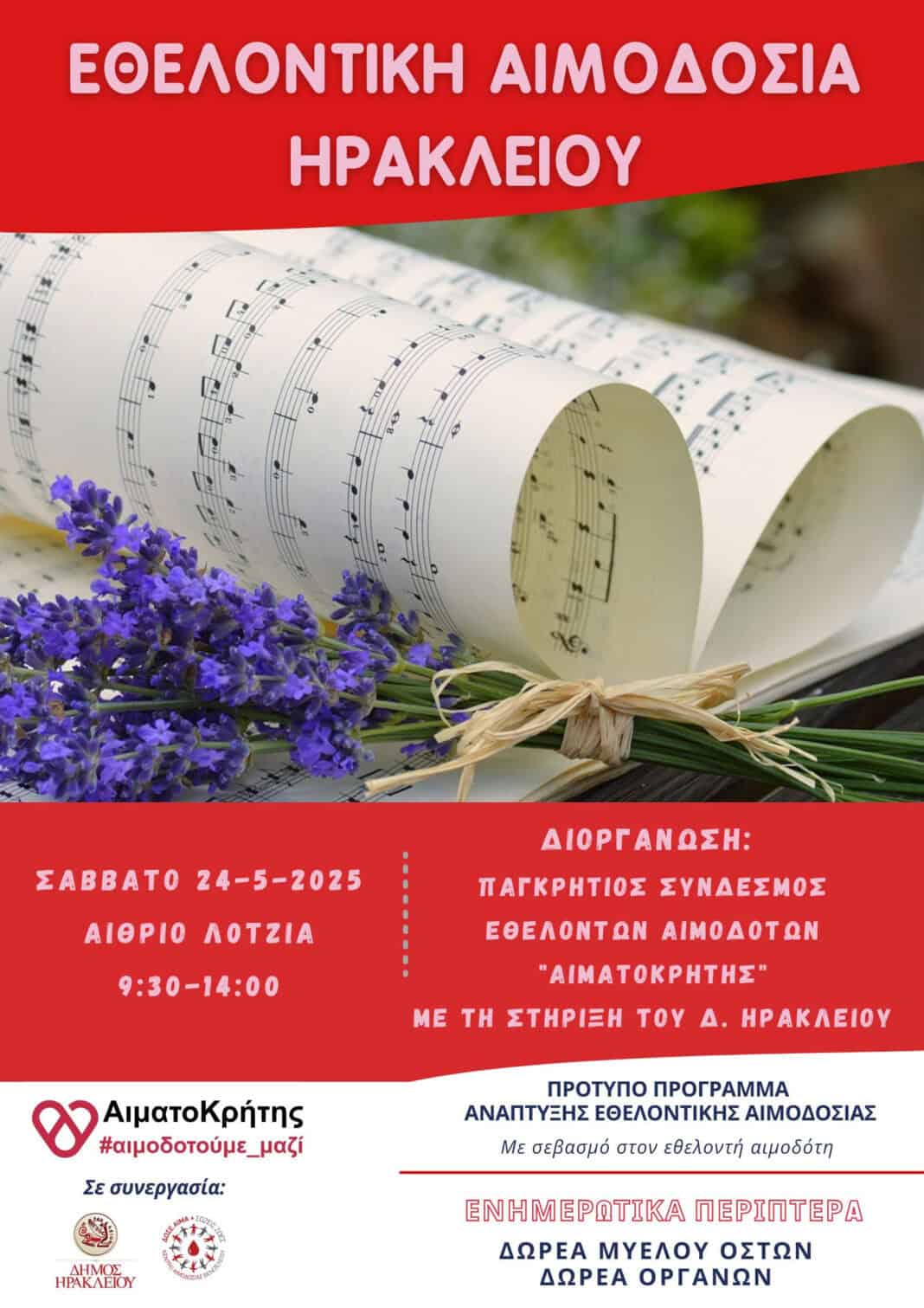 Το Σάββατο 24 Mαίου 2025 θα πραγματοποιηθεί εθελοντική αιμοδοσία στο κέντρο της πόλης του Ηρακλείου και συγκεκριμένα στο αίθριο της Λότζια από τις 09:30 έως τις 14:00.