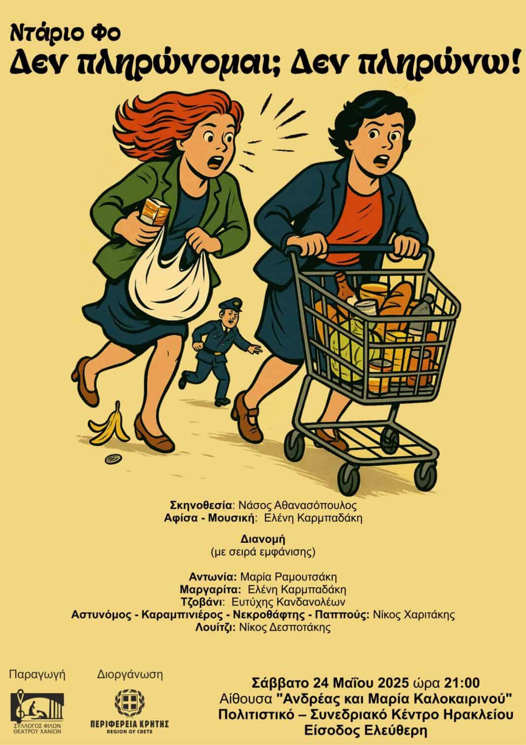 Ο Σύλλογος Φίλων Θεάτρου Χανίων παρουσιάζει το έργο του Ντάριο Φο «Δεν πληρώνομαι; Δεν πληρώνω!», με τη στήριξη της Περιφέρειας Κρήτης.