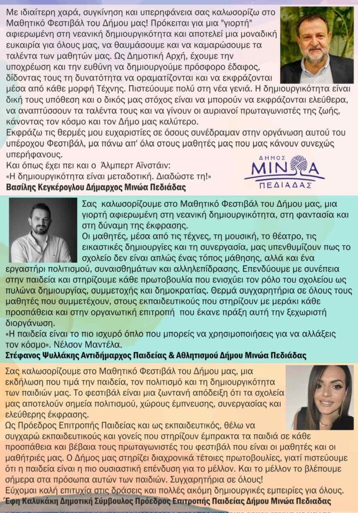 Ο Δήμαρχος Μινώα Πεδιάδας Βασίλης Κεγκέρογλου ανέφερε: «Θέλουμε το Μαθητικό Φεστιβάλ Δήμου Μινώα Πεδιάδας να αποτελέσει ξανά ένα φωτεινό σημείο αναφοράς για έναν καλύτερο κόσμο, αναδεικνύοντας τη δύναμη της εκπαίδευσης και της δημιουργίας. Να αποτελέσει μια σημαντική πρωτοβουλία για την ενίσχυση της πολιτιστικής και κοινωνικής σύνδεσης μεταξύ των μαθητών, των οικογενειών τους και της τοπικής κοινωνίας”.