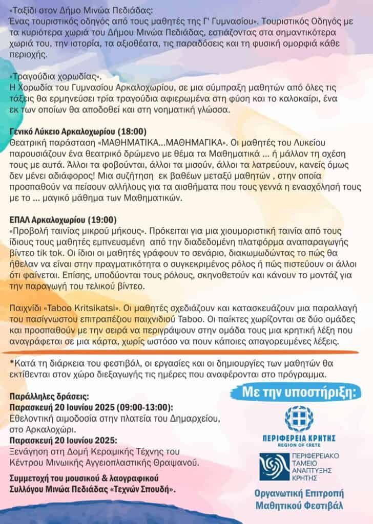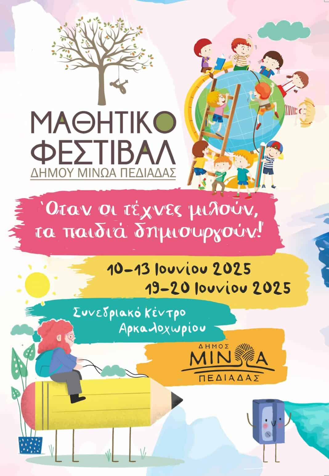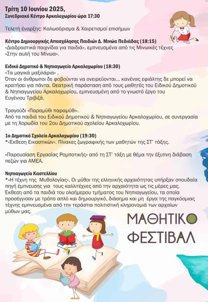 Ο Δήμος Μινώα Πεδιάδας ανακοινώνει την επαναφορά του θεσμού του Μαθητικού Φεστιβάλ, που στοχεύει στην ενίσχυση της συμμετοχής, της δημιουργικότητας των μαθητών και της προβολής των καλλιτεχνικών τους δραστηριοτήτων.