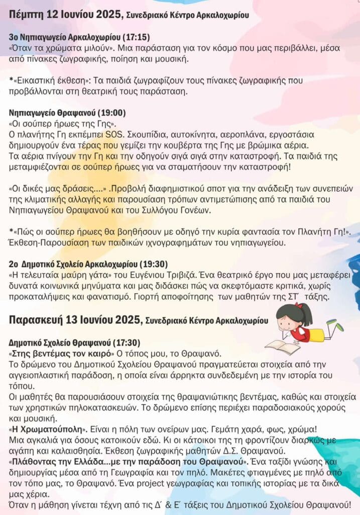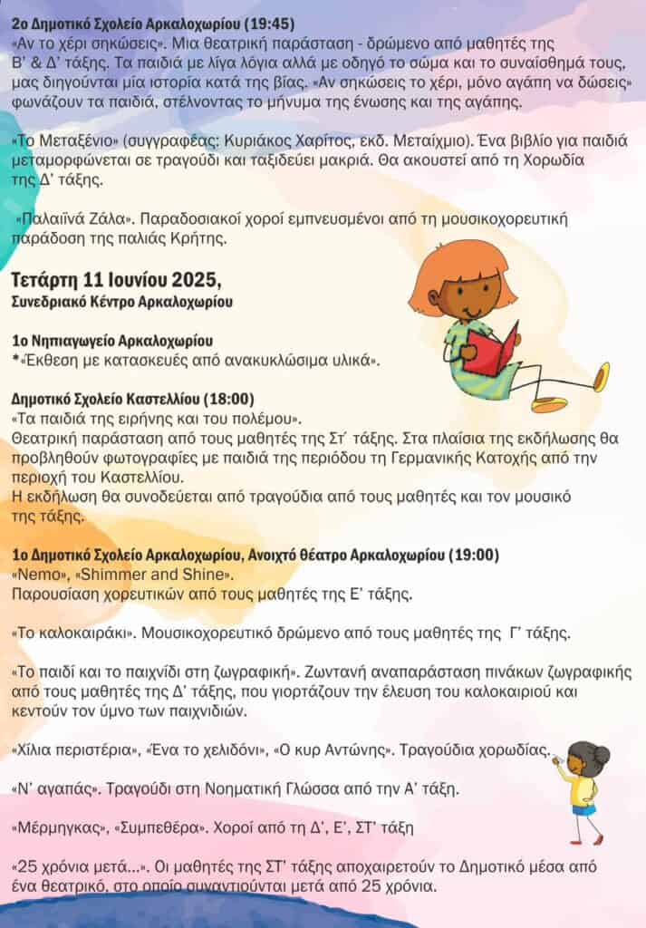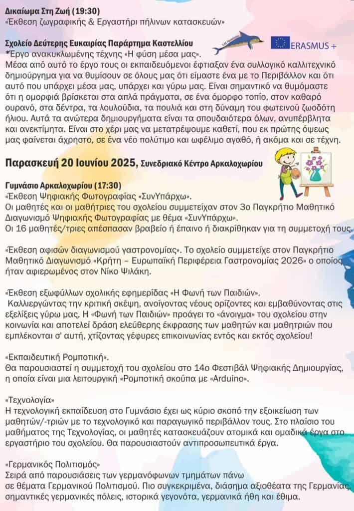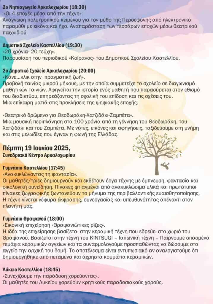 Για το τρέχον σχολικό έτος 2024-2025, το Μαθητικό Φεστιβάλ θα πραγματοποιηθεί το χρονικό διάστημα 10-13 Ιουνίου 2025 & 19-20 Ιουνίου 2025. Η θεματική του θα είναι η «Τέχνη» και θα πραγματοποιηθεί στο Αρκαλοχώρι, με επίκεντρο το Συνεδριακό Κέντρο Αρκαλοχωρίου.