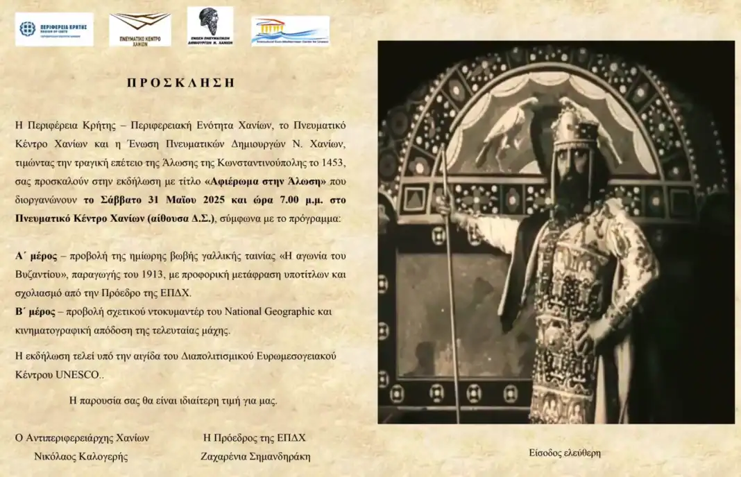 H Περιφέρεια Κρήτης – Περιφερειακή Ενότητα Χανίων, το Πνευματικό Κέντρο Χανίων και η Ένωση Πνευματικών Δημιουργών Ν. Χανίων, τιμώντας την τραγική επέτειο της Άλωσης της Κωνσταντινούπολης το 1453, σας προσκαλούν στην εκδήλωση με τίτλο «Αφιέρωμα στην Άλωση» που διοργανώνουν το Σάββατο 31 Μαΐου 2025 και ώρα 7.00 μ.μ. στο Πνευματικό Κέντρο Χανίων (αίθουσα Δ.Σ.), σύμφωνα με το ακόλουθο πρόγραμμα: