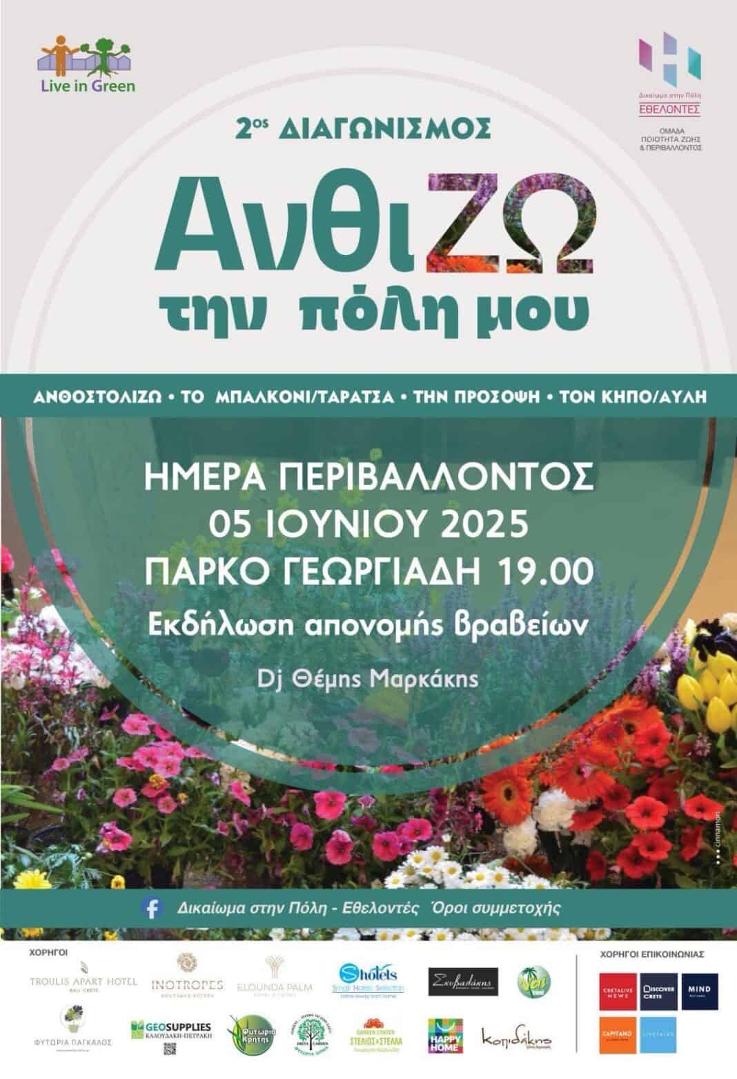 Σας προσκαλούμε στην απονομή των βραβείων για τον 2ο Διαγωνισμό «Ανθί-ΖΩ την πόλη μου», ο οποίος διοργανώνεται από την εθελοντική ομάδα ποιότητας ζωή και περιβάλλοντος της Δημοτικής Παράταξης «Δικαίωμα στην Πόλη», η οποία θα πραγματοποιηθεί την Πέμπτη 5 Ιουνίου, στις 19.00, στο Πάρκο Γεωργιάδη.