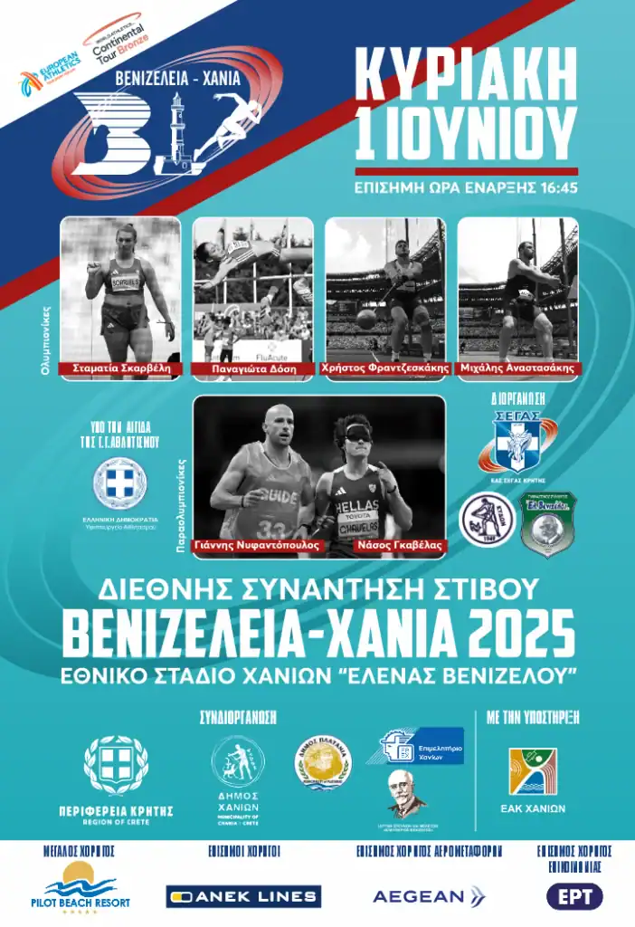 Την Κυριακή 1 Ιουνίου 2025 θα διεξαχθεί στο Εθνικό Στάδιο Χανίων η κορυφαία Διεθνής διοργάνωση στίβου της χώρας μας. Στα «ΒΕΝΙΖΕΛΕΙΑ – ΧΑΝΙΑ 2025» θα πάρουν μέρος 120 και πλέον κορυφαίοι αθλητές από όλο τον κόσμο, στα παρακάτω αγωνίσματα.
