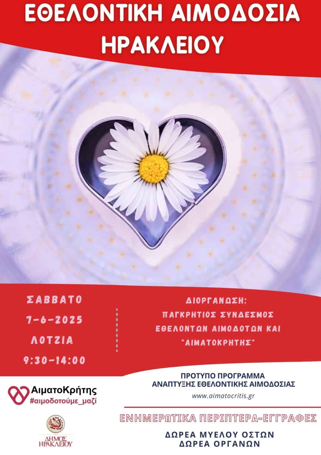Το Σάββατο 7 Ιουνίου 2025 θα πραγματοποιηθεί εθελοντική αιμοδοσία στο κέντρο της πόλης του Ηρακλείου και συγκεκριμένα στο αίθριο της Λότζια από τις 09:30 έως τις 14:00.