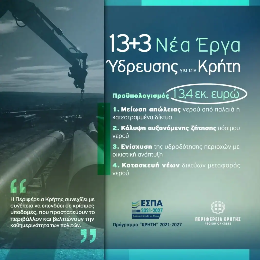Σημαντική ενίσχυση για τις υποδομές ύδρευσης στην Κρήτη αποτελεί η ένταξη τριών νέων έργων στο Περιφερειακό Πρόγραμμα «Κρήτη 2021-2027», με συγχρηματοδότηση από το Ευρωπαϊκό Ταμείο Περιφερειακής Ανάπτυξης (ΕΤΠΑ).