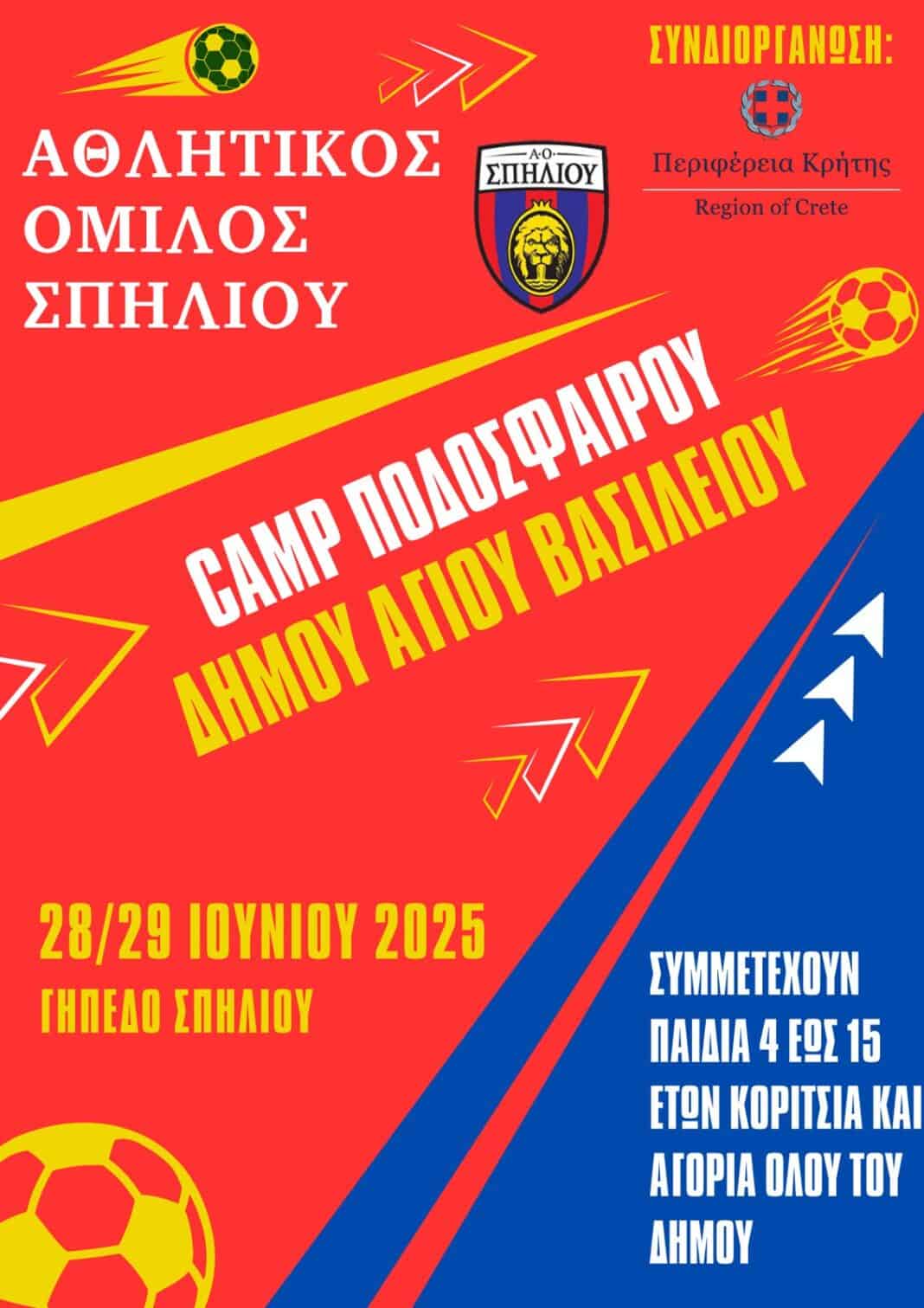 Ο Α.Ο. Σπηλίου, διοργανώνει camp ποδοσφαίρου με την στήριξη της Περιφέρειας Κρήτης, στις 28/29 Ιουνίου στις 17:00 στο γήπεδο Σπηλίου.