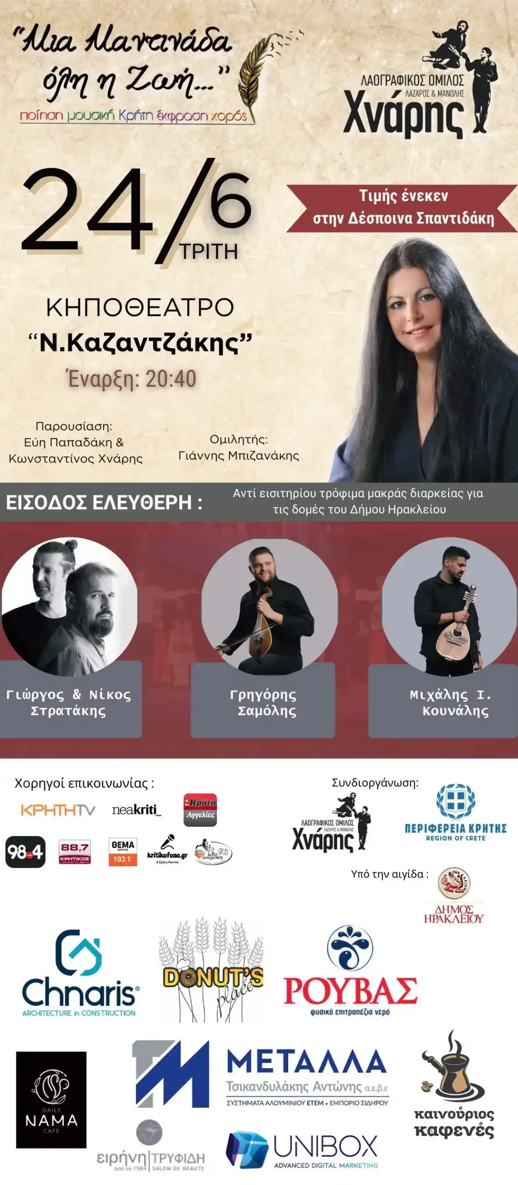 Ο Λαογραφικός Όμιλος «Λάζαρος και Μανόλης Χνάρης», με την υποστήριξη της Περιφέρειας Κρήτης, διοργανώνει τη γιορτή μαντινάδας «Μια Μαντινάδα όλη η ζωή…», την Τρίτη 24 Ιουνίου στις 8:40 μ.μ., στο Κηποθέατρο “Νίκος Καζαντζάκης”, στο Ηράκλειο, με ελεύθερη είσοδο για το κοινό. Πρόκειται για μια βραδιά αφιερωμένη στη ζωντανή ψυχή της κρητικής παράδοσης, με πρωταγωνιστή τον αυθεντικό λαϊκό λόγο: τη μαντινάδα.