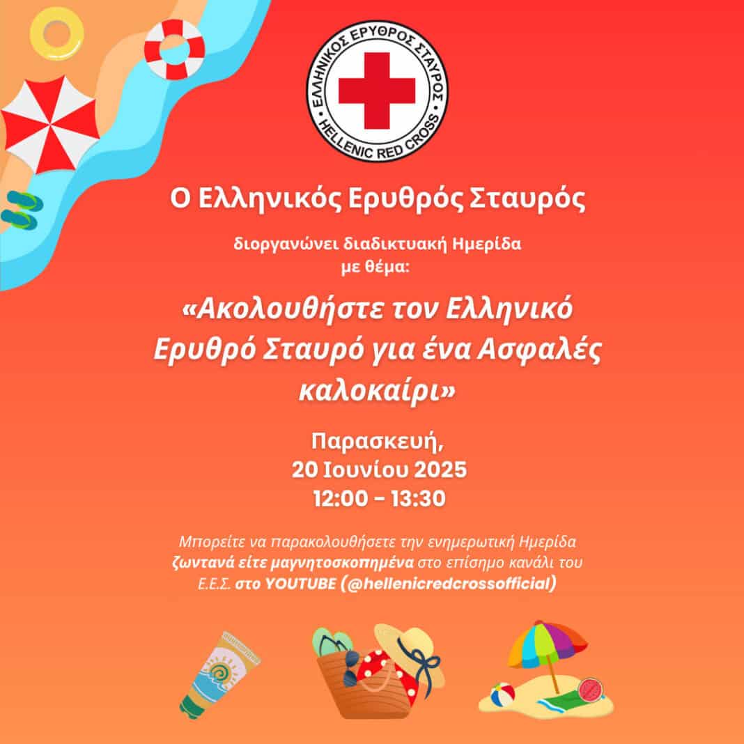 Ο Ελληνικός Ερυθρός Σταυρός, αναγνωρίζοντας διαχρονικά τον θεμελιώδη του ρόλο στην προστασία της ανθρώπινης ζωής και στην προάσπιση του φυσικού περιβάλλοντος, θέτει για ακόμη μία φορά τον άνθρωπο και το περιβάλλον στο επίκεντρο των δράσεων του. Στο πλαίσιο αυτής της ανθρωποκεντρικής και περιβαλλοντικής αποστολής, η Δ/νση Συντονισμού & Επικοινωνίας Νοσηλευτικών Υπηρεσιών Περιφερειακών Τμημάτων ΕΕΣ διοργανώνει ενημερωτική διαδικτυακή ημερίδα με θέμα: «Ακολουθήστε τον Ελληνικό Ερυθρό Σταυρό για ένα ασφαλές καλοκαίρι» σήμερα Παρασκευή 20 Ιουνίου 2025 και ώρες 12:00 – 13:30, η οποία θα μεταδοθεί ζωντανά από το επίσημο κανάλι του Ε.Ε.Σ. στο YOUTUBE εδώ: https://www.youtube.com/@hellenicredcrossofficial/streams