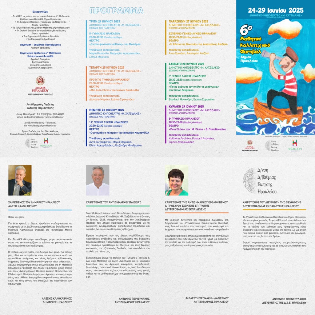 Το Φεστιβάλ θα ανοίξει το 5ο Γυμνάσιο Ηρακλείου με τη θεατρική παράσταση «Ο κατά φαντασίαν ασθενής» του Μολιέρου, στο Δημοτικό Κηποθέατρο «Μάνος Χατζιδάκις», με ώρα έναρξης 20:30 και ελεύθερη είσοδο για το κοινό. Οι μαθητικές παραστάσεις θα συνεχιστούν μέχρι την Κυριακή 29 Ιουνίου 2025 και συγκεκριμένα: με το Πρότυπο Γυμνάσιο Ηρακλείου (25.06.2025), με το 11ο Γενικό Λύκειο Ηρακλείου (26.06.2025), με το Εσπερινό Γενικό Λύκειο Ηρακλείου (27.06.2025), με το 5ο Γενικό Λύκειο Ηρακλείου (28.06.2025) και με το 8ο Γυμνάσιο Ηρακλείου (29.06.2025).