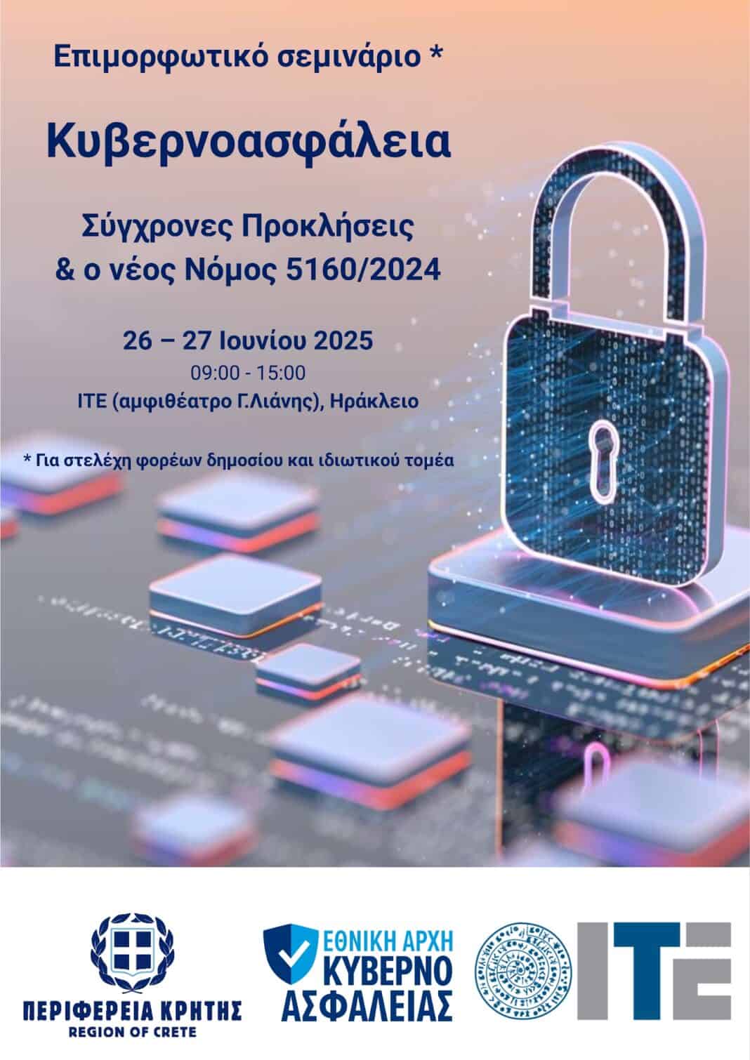 Το σεμινάριο διοργανώνουν η Περιφέρεια Κρήτης σε συνεργασία με την Εθνική Αρχή Κυβερνοασφάλειας και το Ίδρυμα Τεχνολογίας και Έρευνας στις 26 και 27 Ιουνίου, στο Ηράκλειο.