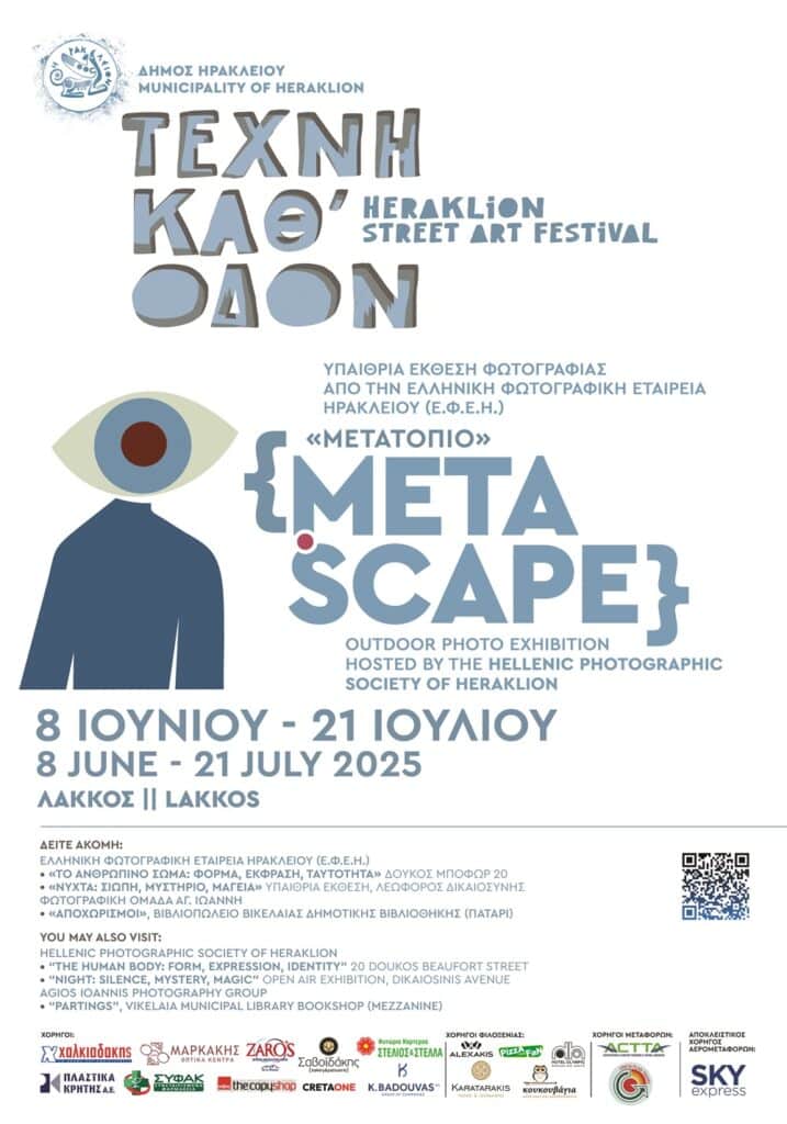 «Μετατοπίο» Υπαίθρια Έκθεση Φωτογραφίας από την Ελληνική Φωτογραφική Εταιρεία Ηρακλείου (Ε.Φ.Ε.Η.). Διάρκεια Έκθεσης: Κυριακή 8 Ιουνίου – Δευτέρα 21 Ιουλίου 2025 .Ένα αλλιώτικο τοπίο… Ένα τοπίο μεταμορφωμένο και μεταλλαγμένο. Μια εξερεύνηση της καινούργιας σχέσης που συνάπτουμε με το χώρο και τη φύση, σαν αποτέλεσμα της αστικοποίησης και της εκτεταμένης χρήσης της τεχνολογίας. Ένας αρχέτυπος διάλογος μεταξύ του άγριου και του ήμερου… Νέα σχέδια, αναπαραστάσεις και φυσικές μορφές στο χώρο που μας περιβάλλει