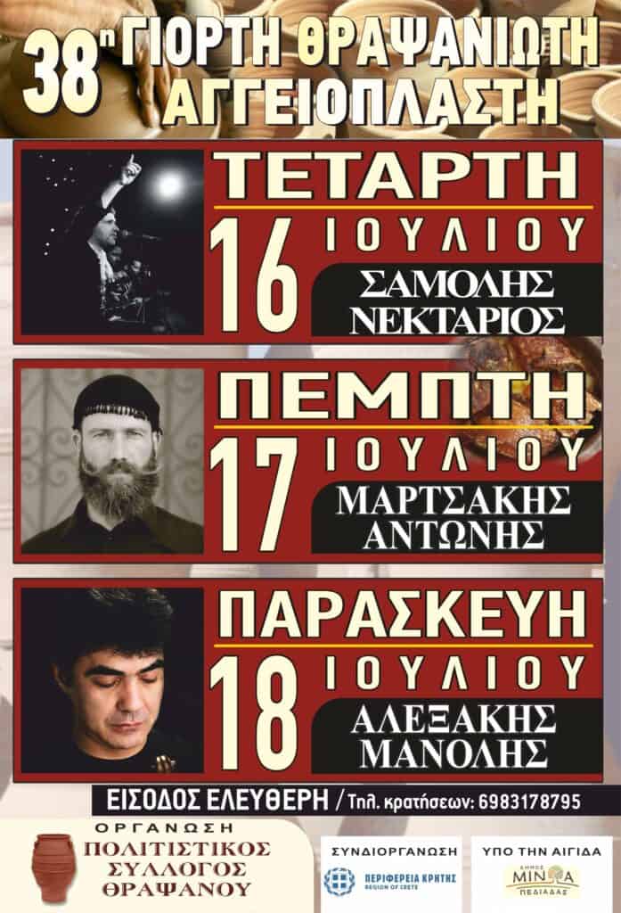 16-17-18 Ιουλίου ( Από τη Πέμπτη16 Ιουλίου αρχίζουν οι 3ήμερες Κρητικές βραδιές «38η ΓΙΟΡΤΗ ΤΟΥ ΘΡΑΨΑΝΙΩΤΗ ΑΓΓΕΙΟΠΛΑΣΤΗ» με κρητικούς καλλιτέχνες στην κεντρική πλατεία του Θραψανού (από τις 21.00΄ κάθε βράδυ)