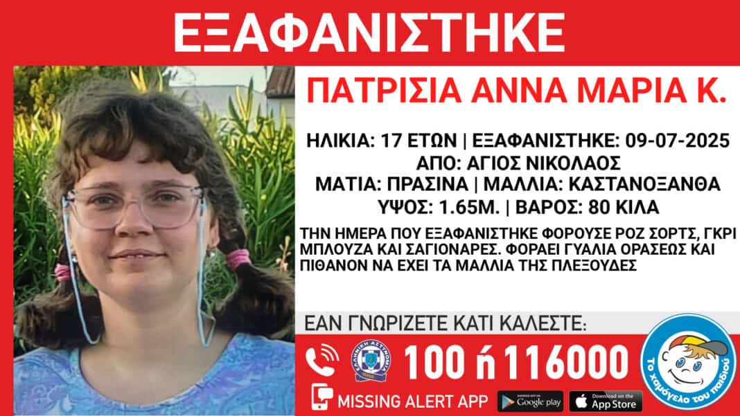Χθες, 09/07/2025, ξημερώματα εξαφανίστηκε από την περιοχή του Αγίου Νικολάου Αττικής, η Πατρίσια Άννα Μαρία Κ., 17 ετών. «Το Χαμόγελο του Παιδιού» ενημερώθηκε για την εξαφάνιση και προχώρησε άμεσα στη δημοσιοποίηση των στοιχείων της ανήλικης, κατόπιν αιτήματος της οικογένειας της, καθώς κρίνεται ότι η ανήλικη διατρέχει άμεσο κίνδυνο.