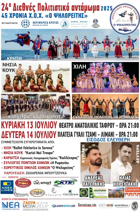 Ο Χορευτικός Όμιλος Χανίων “Ο Ψηλορείτης” διοργανώνει και φέτος το 24ο Διεθνές Πολιτιστικό Αντάμωμα και σας προσκαλεί στην μεγάλη γιορτή χαράς και πολιτισμού.