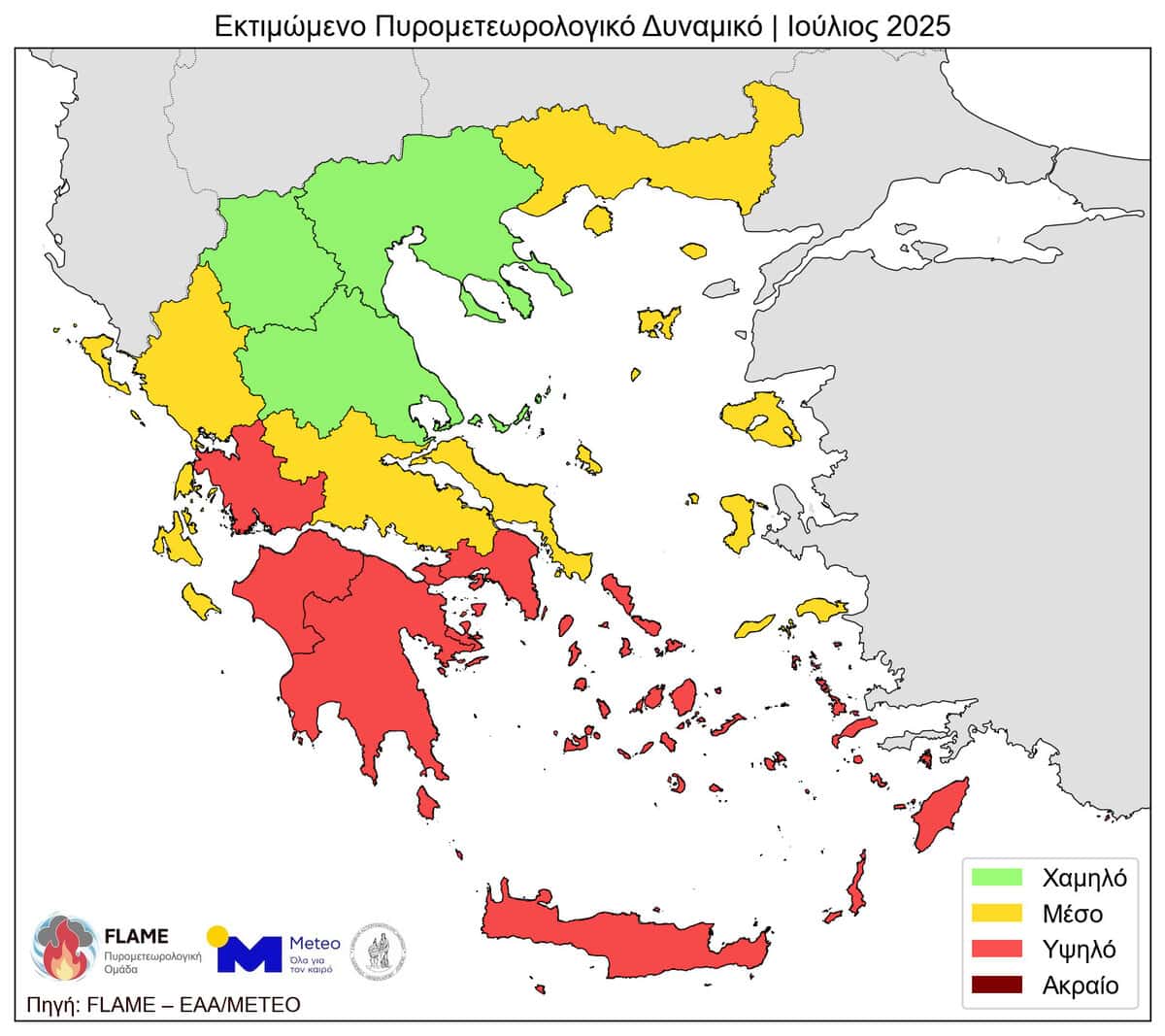 Οι διαθέσιμες εποχικές προγνώσεις υποδεικνύουν αρκετά υψηλότερες θερμοκρασίες και συνθήκες έντονης ατμοσφαιρική ξηρασίας για τον Ιούλιο 2025. Οι συνθήκες αυτές εκτιμάται ότι θα αναβαθμίσουν το πυρομετεωρολογικό δυναμικό: