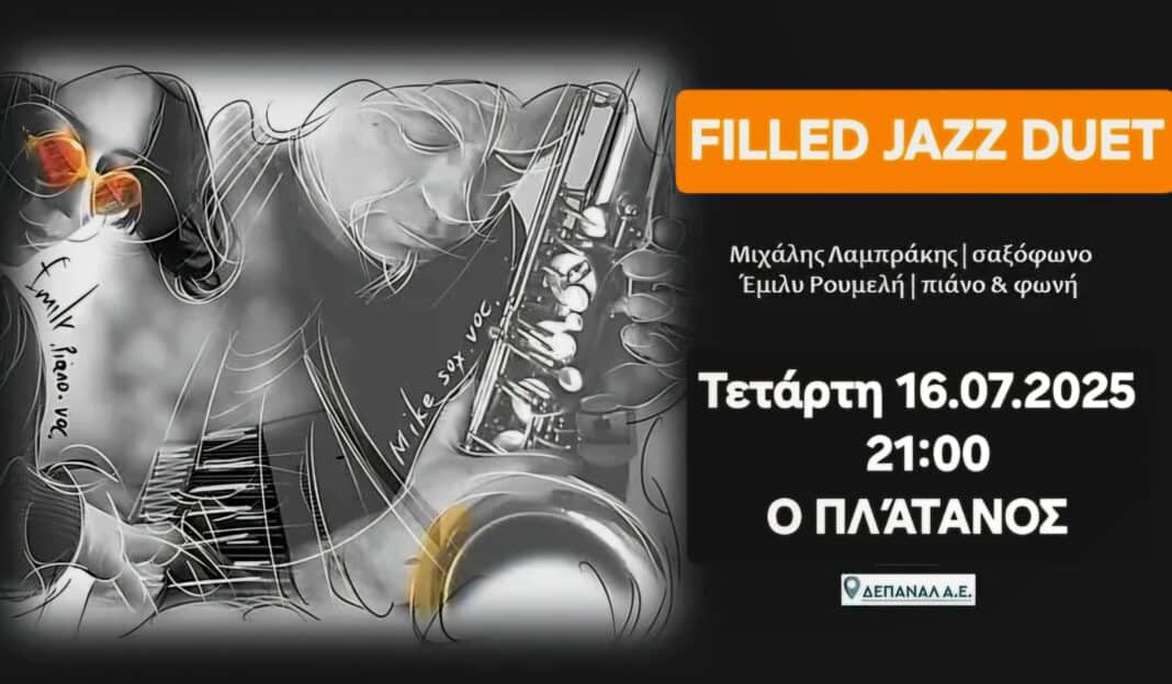 Σήμερα Τετάρτη 16 Ιουλίου στις 21:00, το κοινό θα απολαύσει τους «Filled Jazz Duet», με τον Μιχάλη Λαμπράκη και την Έμιλυ Ρουμελή, σε σαξόφωνο και πιάνο, σε μία ακόμα βραδιά με υπέροχες μουσικές, εξαιρετικές γεύσεις και δροσερά ποτά.