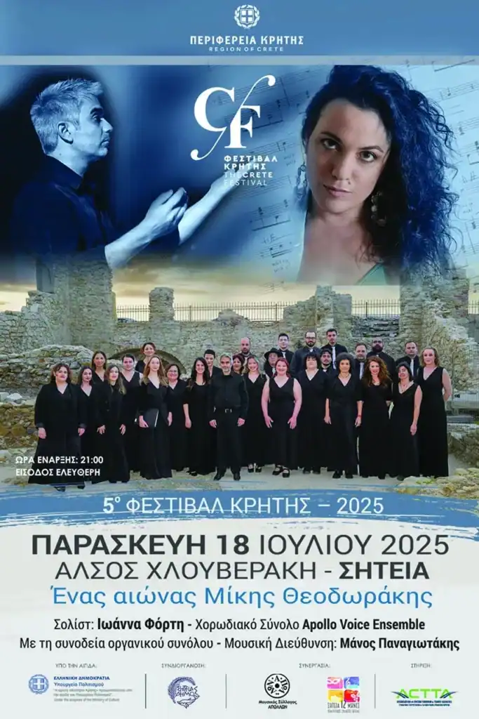 Το Φεστιβάλ της Περιφέρειας Κρήτης, μετά την επιτυχημένη έναρξη του στον αύλειο χώρο του Μουσείου αρχαίας Ελεύθερνας συνεχίζει το ταξίδι του και συγκεκριμένα στην Σητεία.  Την Παρασκευή 18 Ιουλίου και ώρα 21:00   στο Άλσος Χλουβεράκη, σε συνεργασία με τον Δήμο Σητείας θα παρουσιαστεί η εκδήλωση με τίτλο: «Ένας αιώνας Μίκης Θεοδωράκης»,  με αφορμή τη συμπλήρωση 100 χρόνων από τη γέννηση του.