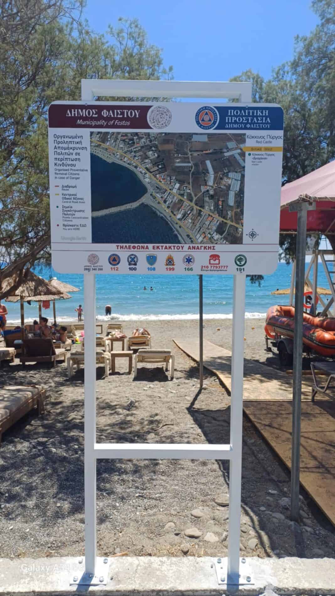 Το ολοκληρωμένο σχέδιο έχει αποτυπωθεί επί χάρτου και περιλαμβάνει σαφείς οδηγίες για την έγκαιρη και ασφαλή αντίδραση των πολιτών. Ήδη έχουν τοποθετηθεί πινακίδες στις τρεις βασικές δημοτικές ενότητες, ενώ νέες πινακίδες προστέθηκαν πρόσφατα σε τοπικές κοινότητες και οικισμούς των Δημοτικών Ενοτήτων του Δήμου Φαιστού και συγκεκριμένα στις εξής περιοχές: