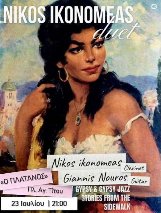 Την Τετάρτη 23 Ιουλίου οι «Gypsy & Gypsy Jazz» με τους Νίκο Οικονομέα στο κλαρίνο και τον Γιάννη Νούρο στην κιθάρα, υπόσχονται μία υπέροχη μουσική βραδιά στο κέντρο της πόλης του Ηρακλείου.