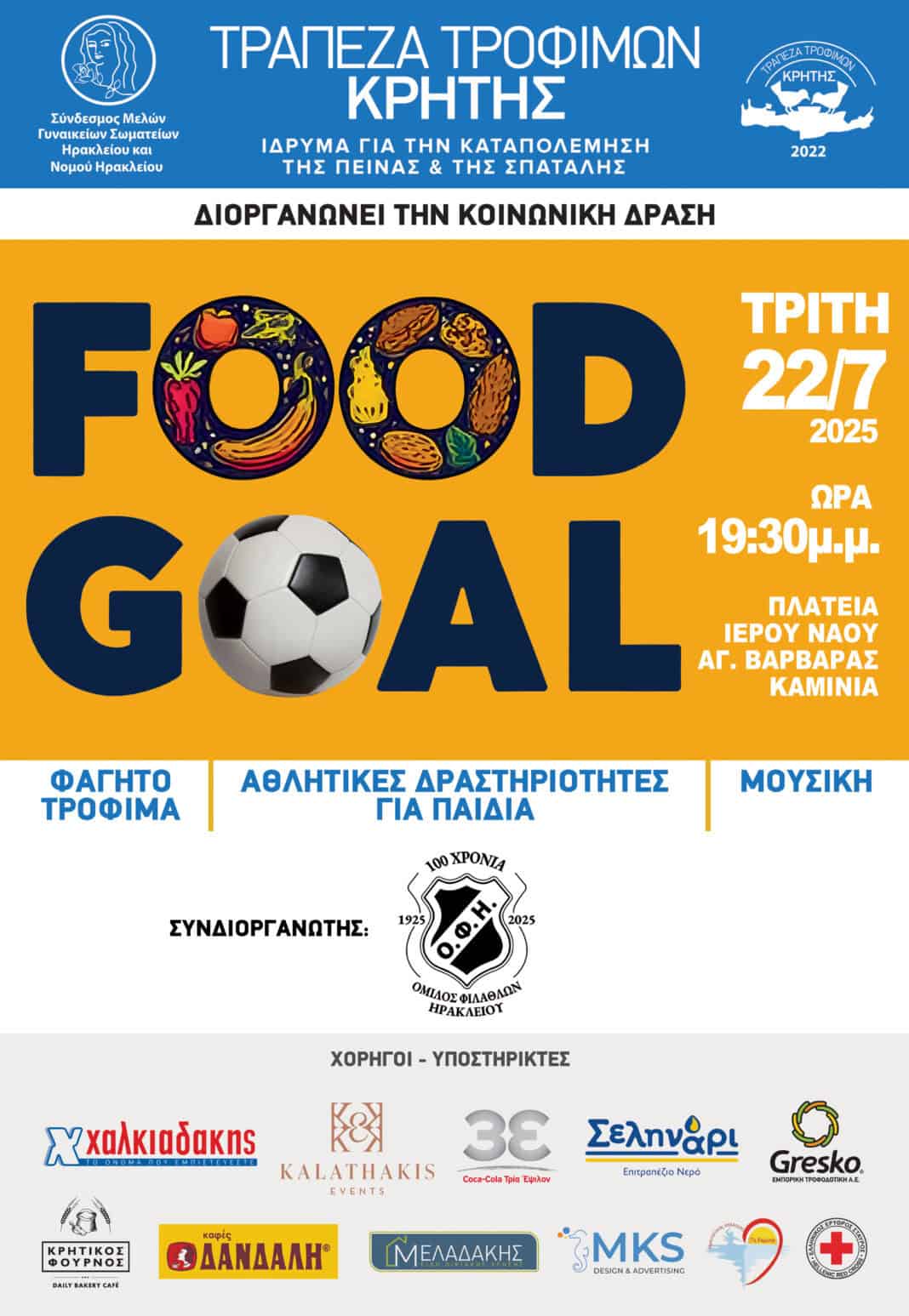Την κοινωνική δράση με τίτλο «Food Goal» διοργανώνει η Τράπεζα Τροφίμων Κρήτης, υπό τη διαχειριστική ευθύνη του «Συνδέσμου Μελών Γυναικείων Σωματείων Ηρακλείου και Ν. Ηρακλείου», από κοινού με τον Ερασιτέχνη ΟΦΗ, με στόχο να επικοινωνηθεί το έργο της Τράπεζας Τροφίμων Κρήτης, ο τρόπος λειτουργίας της, οι Δομές που υποστηρίζει και οι συνεργασίες που αναπτύσσει με στόχο την καταπολέμηση της φτώχειας και της επισιτιστικής ανασφάλειας.