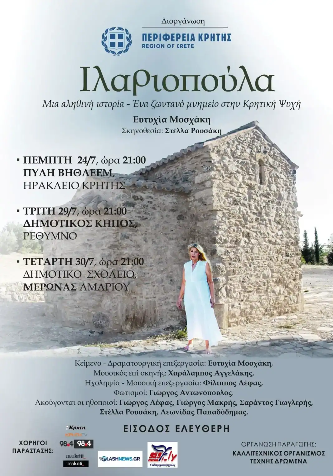 Την Πέμπτη, 24 Ιουλίου 2025 και ώρα 9:00μ.μ., παρουσιάζεται στην Πύλη Βηθλεέμ, σε διοργάνωση της Περιφέρειας Κρήτης, η θεατρική παράσταση «Ιλαριοπούλα», με ελεύθερη είσοδο για το κοινό. Επίσης, η παράσταση θα παρουσιαστεί την Τρίτη, 29/7/2025 στον Δημοτικό Κήπο Ρεθύμνου στις 9:00μ.μ. και την Τετάρτη, 30/7/2025, στο Δημοτικό Σχολείο Μέρωνα, στις 9:00μ.μ.