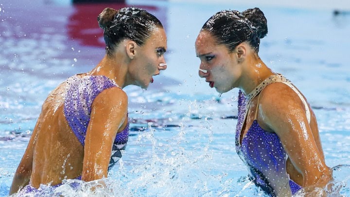 Το χρυσό μετάλλιο κατέκτησαν οι Λιλού Γιουίς και Ιρις Τίο Κάσας από την Ισπανία, που συγκέντρωσαν 282.6087 βαθμούς, αν και δεν είχαν το δυσκολότερο πρόγραμμα (υπερείχαν όμως σημαντικά στην καλλιτεχνική εντύπωση). Τη δεύτερη θέση πήραν οι Ιταλίδες Ενρίκα Πίκολι και Λουκρέτσια Ρουτζέρο με 278.7137 βαθμούς και την τρίτη οι ουδέτερες Μάγια Ντορόσκο και Τατιάνα Γκαϊντάι (Ρωσίδες) με 277.1117β., ενώ έμειναν εκτός βάθρου οι δίδυμες αδελφές Λιν από την Κίνα. Σημειώνεται ότι στο ελεύθερο πρόγραμμα δεν συμμετείχαν οι αδελφές Αλεξανδρή, οι οποίες αναδείχθηκαν πρωταθλήτριες κόσμου στο τεχνικό, εκπροσωπώντας την Αυστρία.