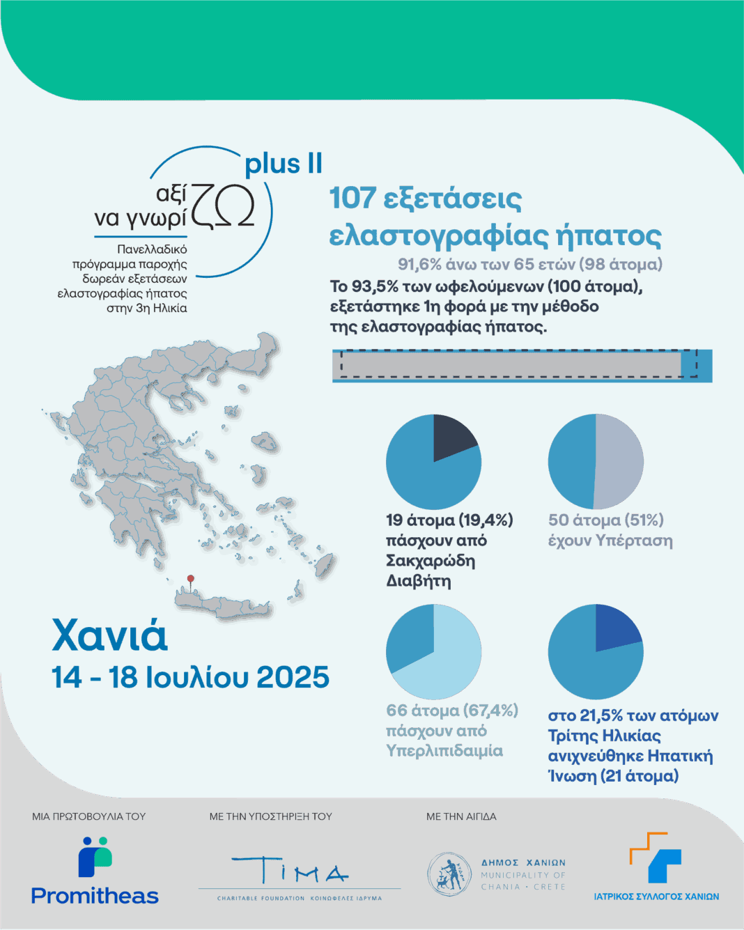 Ειδικότερα, το 93,5% των ωφελούμενων (100 άτομα), εξετάστηκε 1η φορά με την μέθοδο της ελαστογραφίας ήπατος. Επίσης, 19 άτομα (19,4%) της Τρίτης Ηλικίας πάσχουν από Σακχαρώδη Διαβήτη, 50 άτομα (51,0%) πάσχουν από Υπέρταση, 66 άτομα (67,4%) πάσχουν από Υπερλιπιδαιμία και στο 21,5% των ατόμων Τρίτης Ηλικίας ανιχνεύθηκε Ηπατική Ίνωση (21 άτομα).