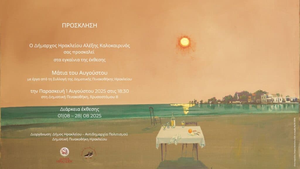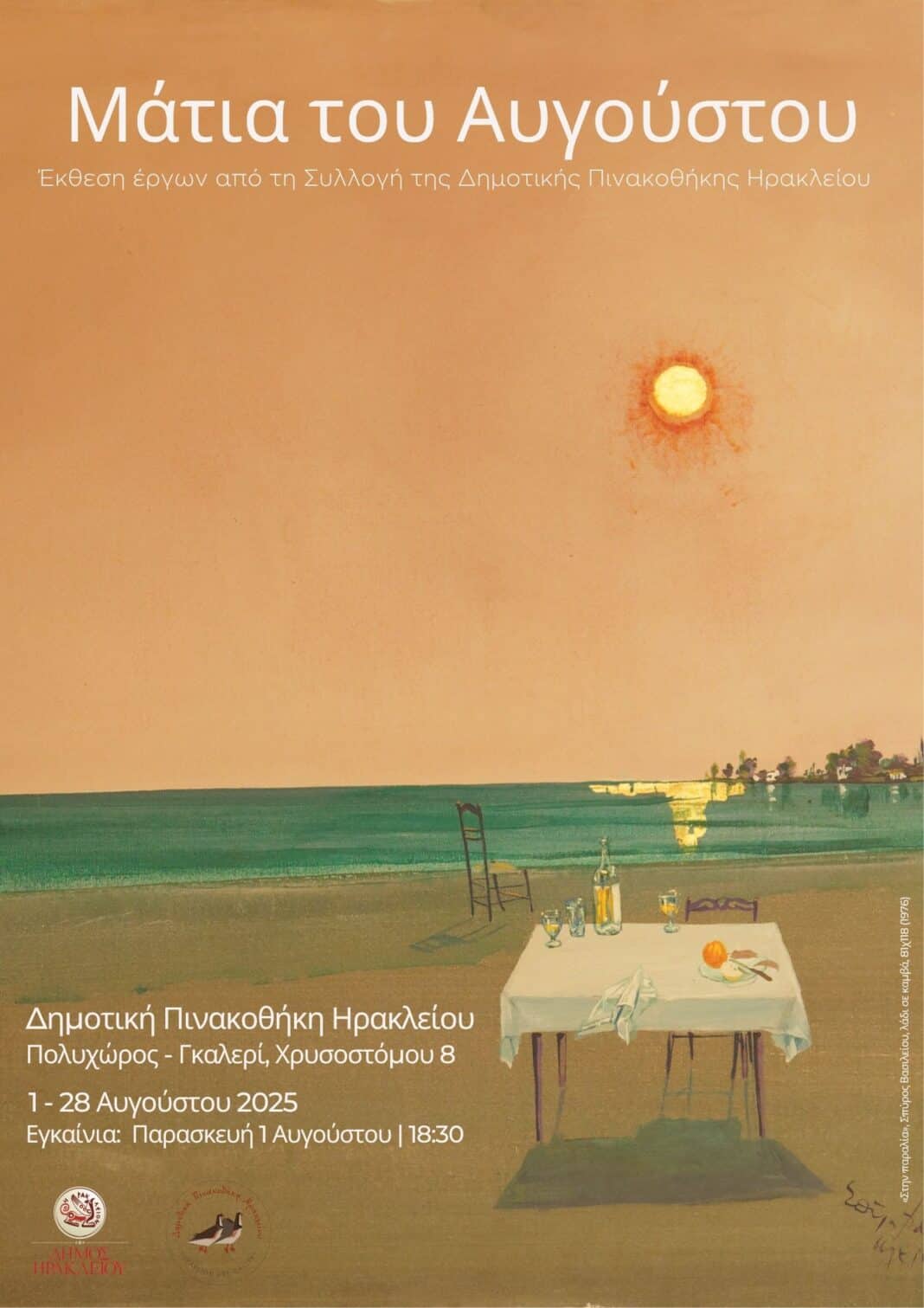 Με 60 έργα ζωγραφικής και χαρακτικής από την Συλλογή της, η Δημοτική Πινακοθήκη Ηρακλείου υποδέχεται τον Αύγουστο με μία θεματική έκθεση με τίτλο Μάτια του Αυγούστου. Την έκθεση θα εγκαινιάσει ο Δήμαρχος Ηρακλείου Αλέξης Καλοκαιρινός, την Παρασκευή 1 Αυγούστου, στις 18:30 το απόγευμα  στον Πολυχώρο της Δημοτικής Πινακοθήκης (Χρυσοστόμου 8).