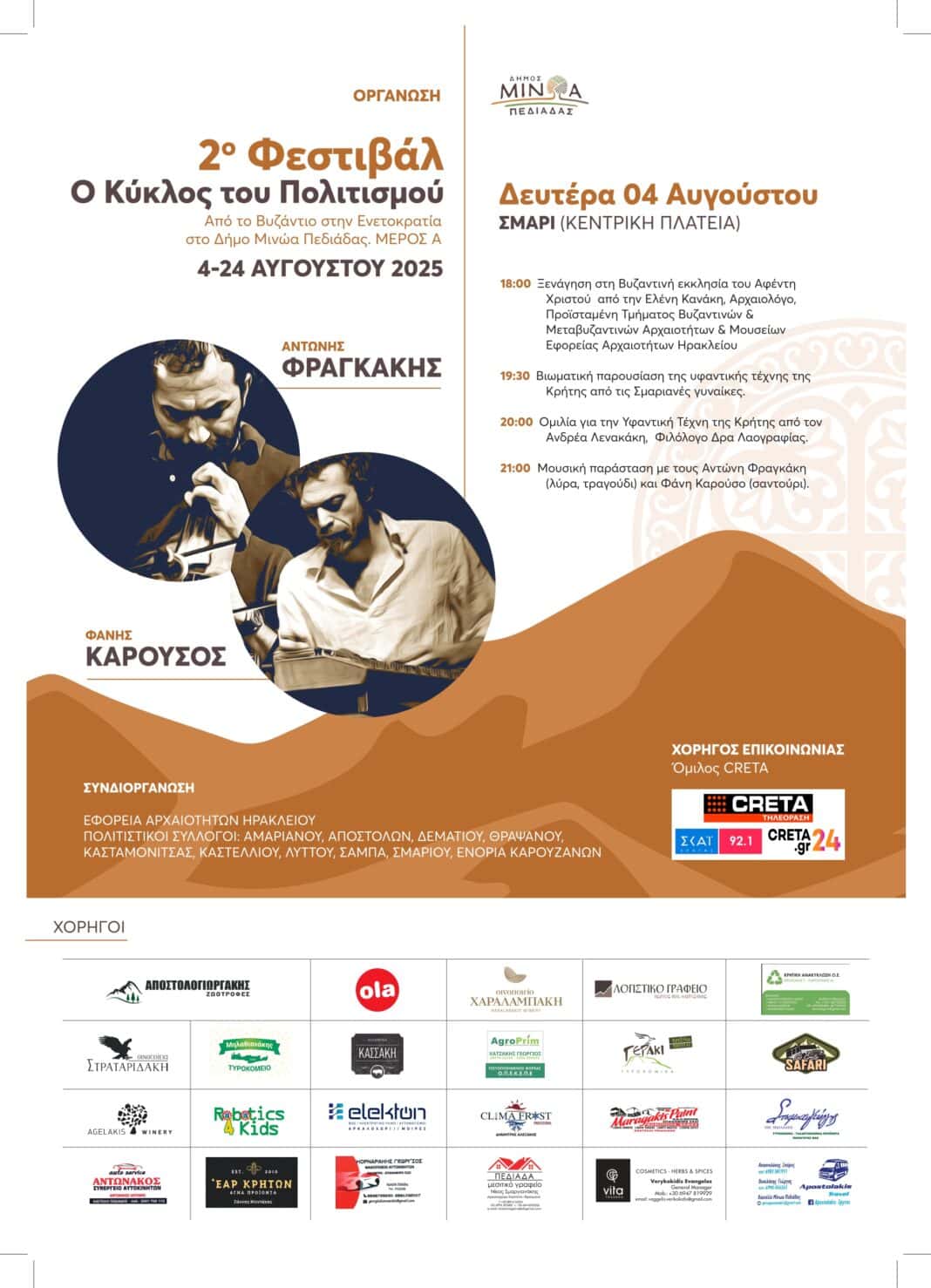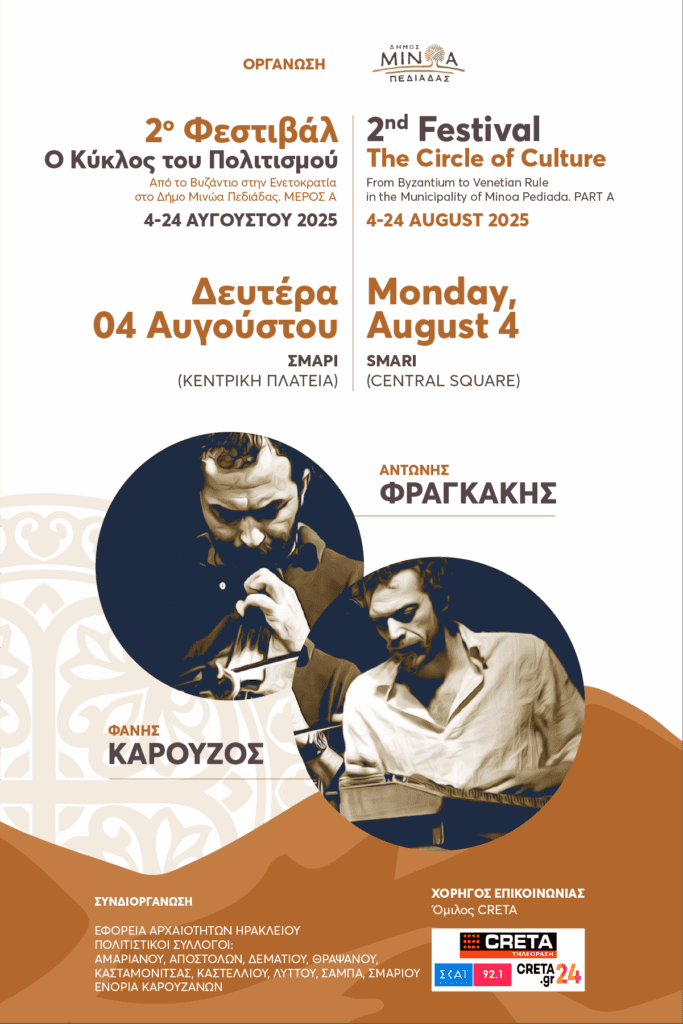 Ανοίγει τη Δευτέρα 4 Αυγούστου, η αυλαία του 2ου θεματικού Φεστιβάλ «Ο Κύκλος του Πολιτισμού, με τίτλο: «Από το Βυζάντιο στην Ενετοκρατία στο Δήμο Μινώα Πεδιάδας».