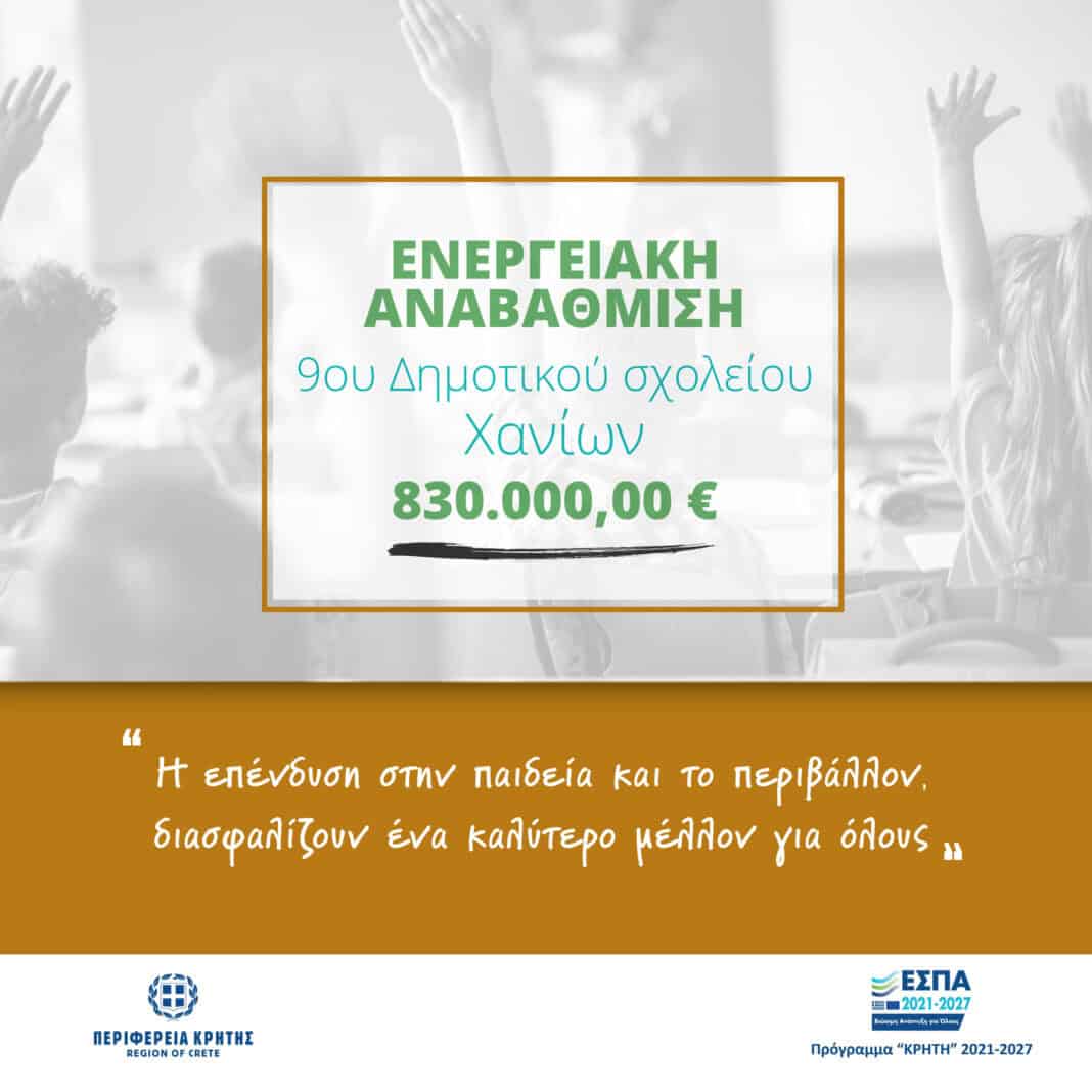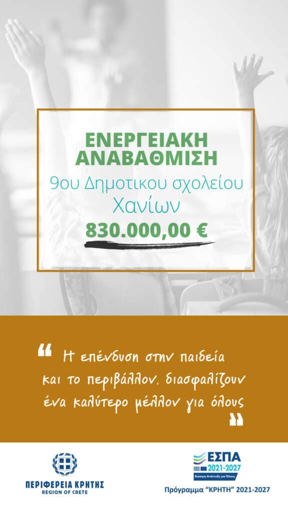 Την ένταξη του έργου «Ενεργειακή Αναβάθμιση 9ου Δημοτικού Σχολείου Χανίων» στο Περιφερειακό Πρόγραμμα «Κρήτη 2021–2027», υπέγραψε ο Περιφερειάρχης Κρήτης Σταύρος Αρναουτάκης.