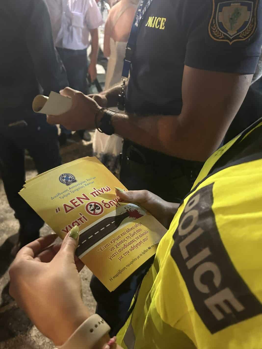 Στο πλαίσιο δράσεων για την οδική ασφάλεια, αστυνομικοί του Τμήματος Τροχαίας Χανίων, βρέθηκαν σε παραδοσιακή πολιτιστική εκδήλωση σε περιοχή των Χανίων και διαμοίρασαν ενημερωτικά έντυπα στους παρευρισκόμενους υπενθυμίζοντας ότι αλκοόλ και οδήγηση δεν πάνε μαζί.