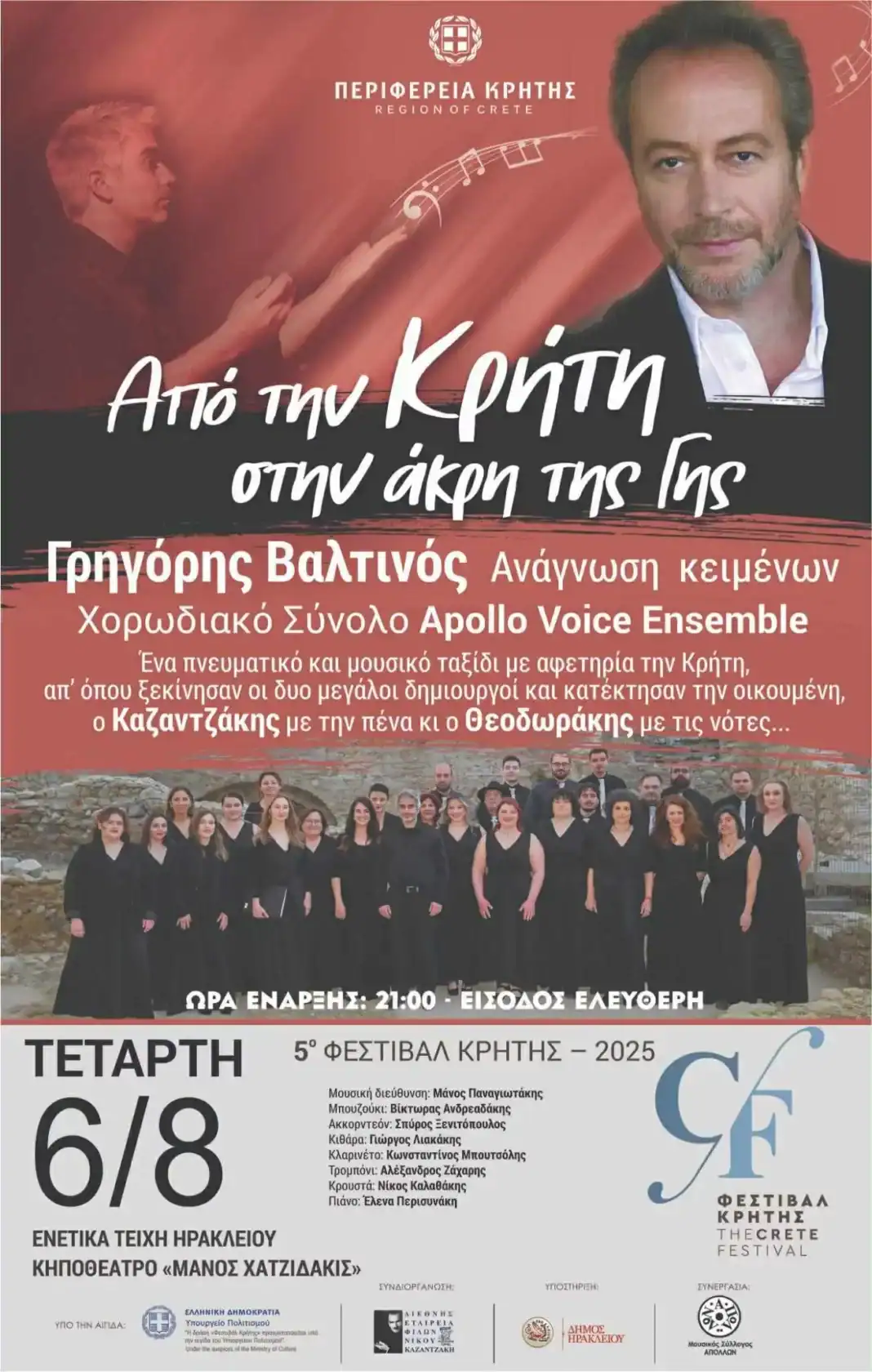 Στο πλαίσιο του 5ου Φεστιβάλ Κρήτης, η Περιφέρεια Κρήτης σε συνεργασία με την Διεθνή Εταιρία Φίλων Νίκου Καζαντζάκη, παρουσιάζουν τη μουσική εκδήλωση «Από την Κρήτη στην άκρη της γης», σήμερα Τετάρτη 6 Αυγούστου 2025 στο Κηποθέατρο «Μάνος Χατζιδάκις» στις 9 το βράδυ με ελεύθερη είσοδο.