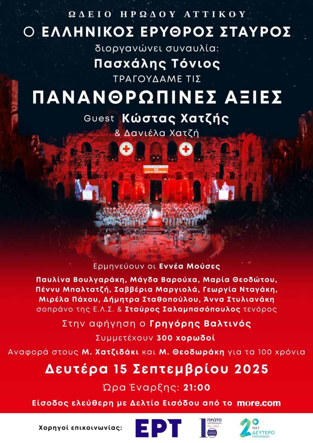 Ο Ελληνικός Ερυθρός Σταυρός (E.E.Σ), την Δευτέρα 15 Σεπτεμβρίου 2025, στις 21:00, στο Ηρώδειο, διοργανώνει μεγάλη συναυλία, με τίτλο: «Τραγουδάμε τις Πανανθρώπινες αξίες», σε Σύνθεση – καλλιτεχνική επιμέλεια Πασχάλη Τόνιου. Ένα ξεχωριστό μουσικό ταξίδι, για τον Άνθρωπο, την Ελπίδα και την Αλληλεγγύη, σε μια εποχή που η ανθρωπότητα αντιμετωπίζει σοβαρές προκλήσεις. Guest εμφάνιση ο σπουδαίος Κώστας Χατζής (μαζί του η Δανιέλα Χατζή), ενώ την αφήγηση υπογράφει ο Γρηγόρης Βαλτινός.