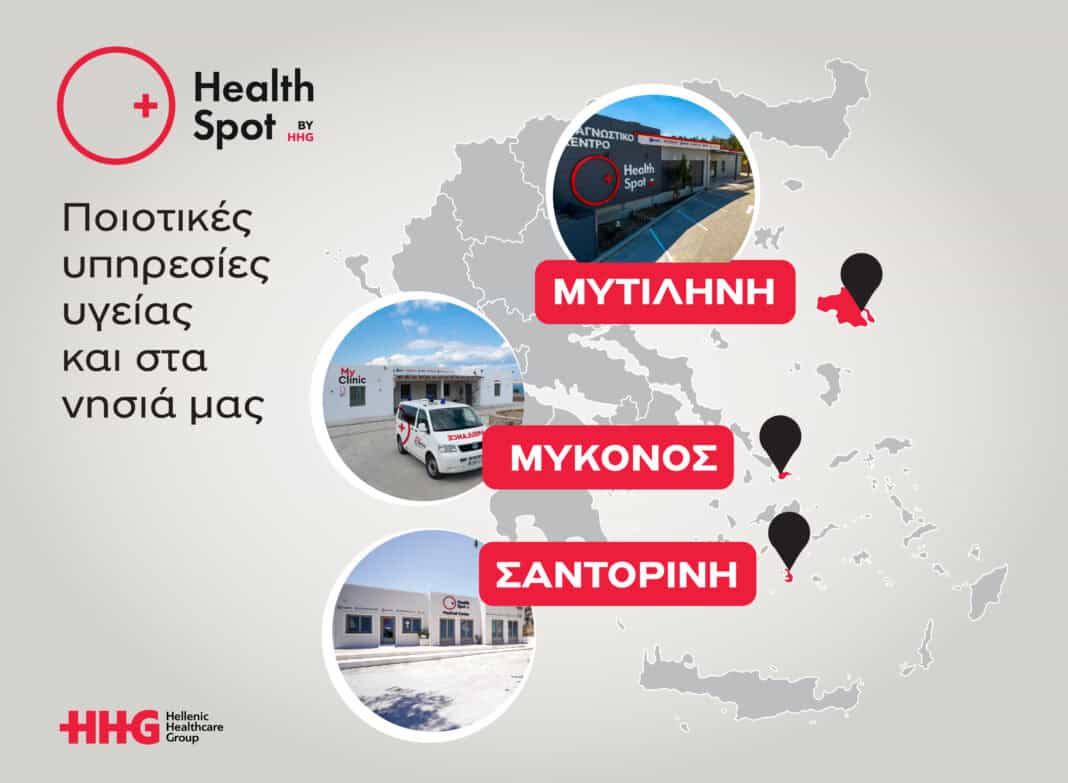 Το Hellenic Healthcare Group (ΗΗG), o μεγαλύτερος όμιλος υγείας στην Ελλάδα, με σκοπό την κάλυψη των ιατρικών αναγκών περιοχών εκτός Αττικής, έχει επεκτείνει το δίκτυο διαγνωστικών του κέντρων και στη νησιώτικη χώρα. Μέχρι στιγμής το δίκτυο καλύπτει τα νησιά της Σαντορίνης, της Μυκόνου και της Μυτιλήνης, ενώ κομβικό σημείο για τον τουρισμό κρουαζιέρας είναι και το HealthSpot Πειραιά.