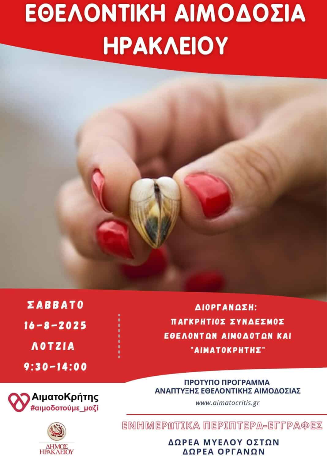 Πρόκειται για μια κοινή προσπάθεια αιμοδοσίας, την οποία διοργανώνει ο Παγκρήτιος Σύνδεσμος Εθελοντών Αιμοδοτών και Δωρητών Οργάνων Σώματος «Αιματοκρήτης» με τη στήριξη του Δήμου Ηρακλείου.