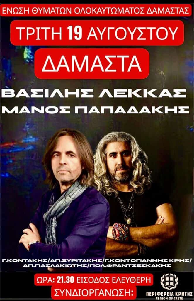Την Τρίτη 19-8-2025 και ώρα 21.30 η Ένωση Θυμάτων Ολοκαυτώματος Δαμάστας σε συνδιοργάνωση με την Περιφέρεια Κρήτης διοργανώνει συναυλία στον προαύλιο χώρο του Δημοτικού Σχολείου Δαμάστας με το συγκρότημα του Μάνου Παπαδάκη και την συμμετοχή του Βασίλη Λέκκα. Η είσοδος θα είναι ελεύθερη.
