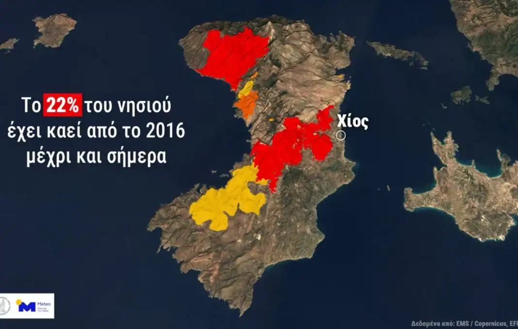 Από το 2016 μέχρι και φέτος (έως και 20/08) περίπου το 22% της επιφάνειας της Χίου έχει καεί από δασικές πυρκαγιές, σύμφωνα με τα στοιχεία του Ευρωπαϊκού Συστήματος Πληροφοριών για τις Δασικές Πυρκαγιές (EFFIS) και της Υπηρεσίας Διαχείρισης Εκτάκτων Αναγκών και Ταχείας Χαρτογράφησης (EMS) του Copernicus, και ανέλυσε η μονάδα METEO του Ε.Α.Α.