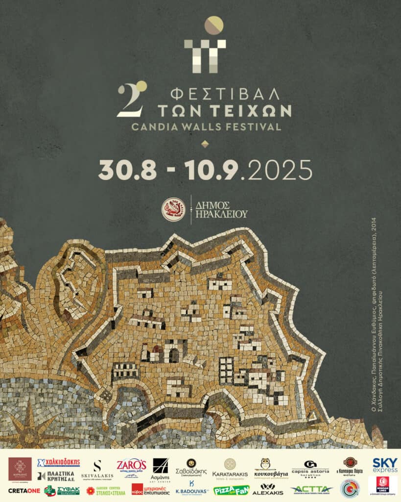 Με περισσότερες από 40 εκδηλώσεις μουσικής, χορού, θεάτρου, κινηματογράφου, λογοτεχνίας, ιστορίας, αστροπαρατήρησης, φωτογραφικών εκθέσεων, ομιλιών, καλλιτεχνικών performance, εργαστηρίου και μουσικών παραστάσεων με επίκεντρο τα κρουστά και σε ακόμα περισσότερα σημεία των Τειχών που μας καλούν να τα γνωρίσουμε, έρχεται το 2ο Φεστιβάλ των Τειχών – Candia Walls Festival του Δήμου Ηρακλείου, από το Σάββατο 30 Αυγούστου ως την Τετάρτη 10 Σεπτεμβρίου 2025.