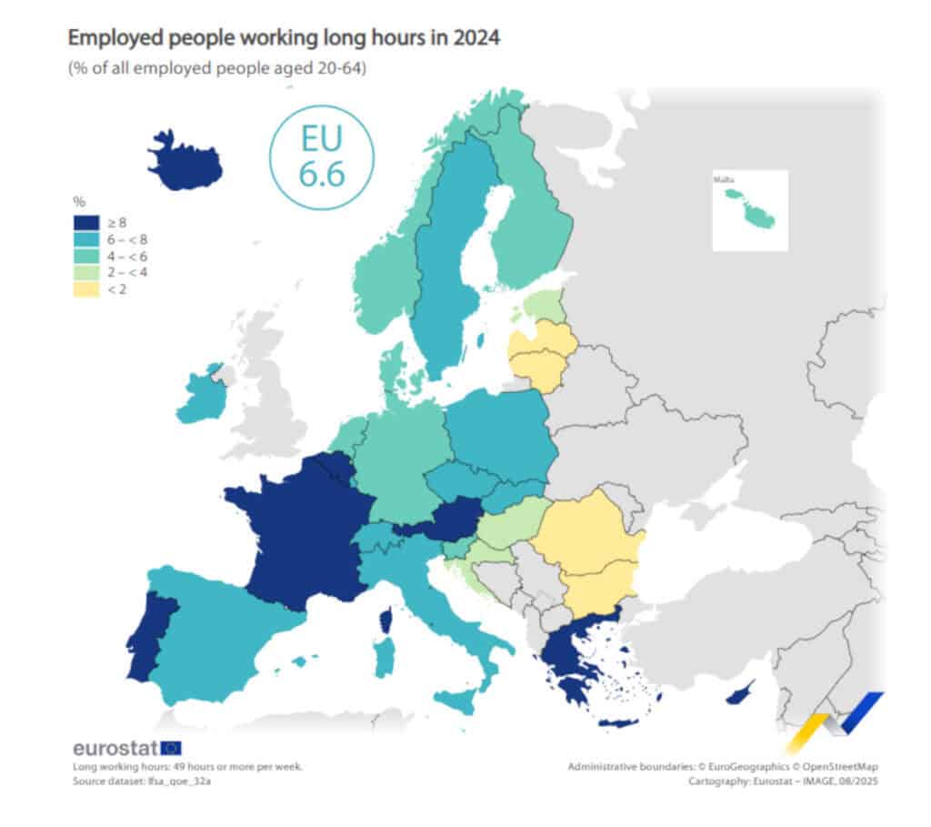 Σε επίπεδο Ευρωπαϊκής Ένωσης, το 6,6% των απασχολούμενων το 2024 εργάστηκε μακρά ωράρια, ποσοστό που καταγράφει σταθερή μείωση τα τελευταία χρόνια. Ενδεικτικά, το 2014 ανερχόταν σε 9,8% και το 2019 σε 8,4%.