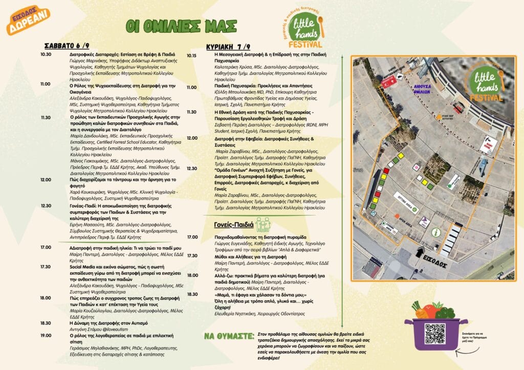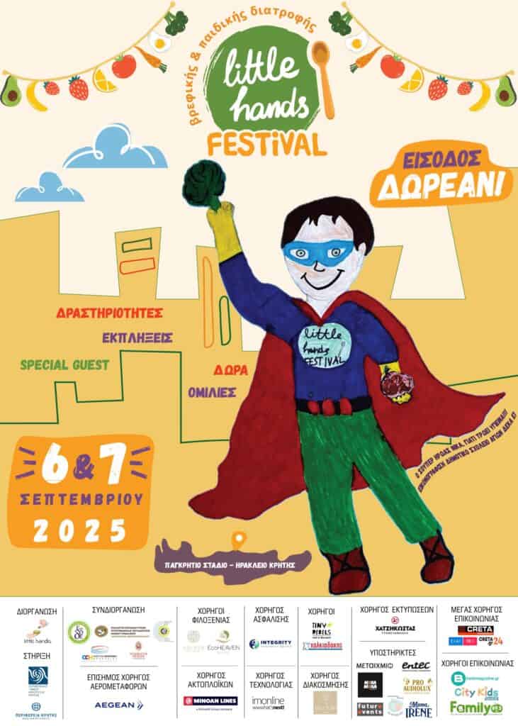 Το πολυαναμενόμενο Little Hands Festival, το Φεστιβάλ Βρεφικής και Παιδικής Διατροφής που κατέκτησε μικρούς και μεγάλους, επιστρέφει το Σάββατο 6 και την Κυριακή 7 Σεπτεμβρίου στον περιβάλλοντα χώρο του Παγκρητίου Σταδίου. Με ώρες λειτουργίας 10:00 – 13:30 και 16:00 – 21:30 και ελεύθερη είσοδο για όλους, το φεστιβάλ υπόσχεται δύο ημέρες γεμάτες παιχνίδι, μουσική, γνώση και αξέχαστες εμπειρίες για όλη την οικογένεια.