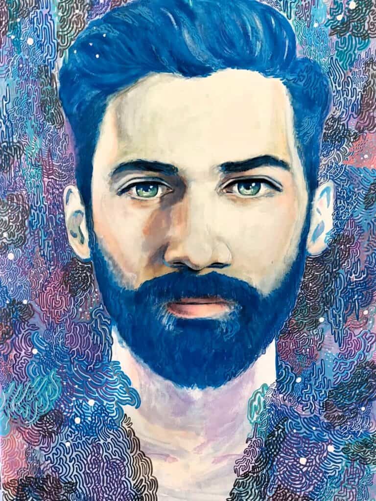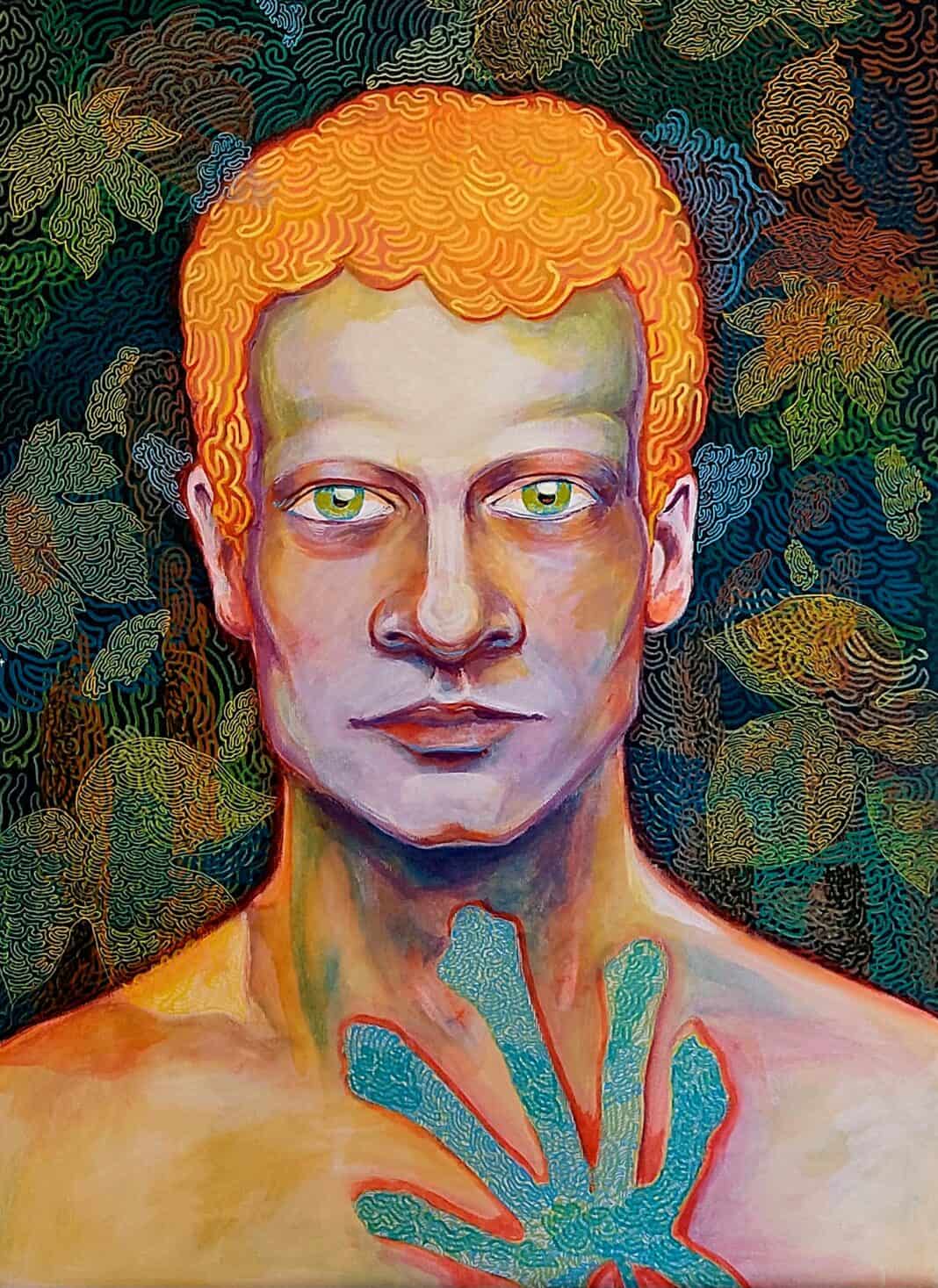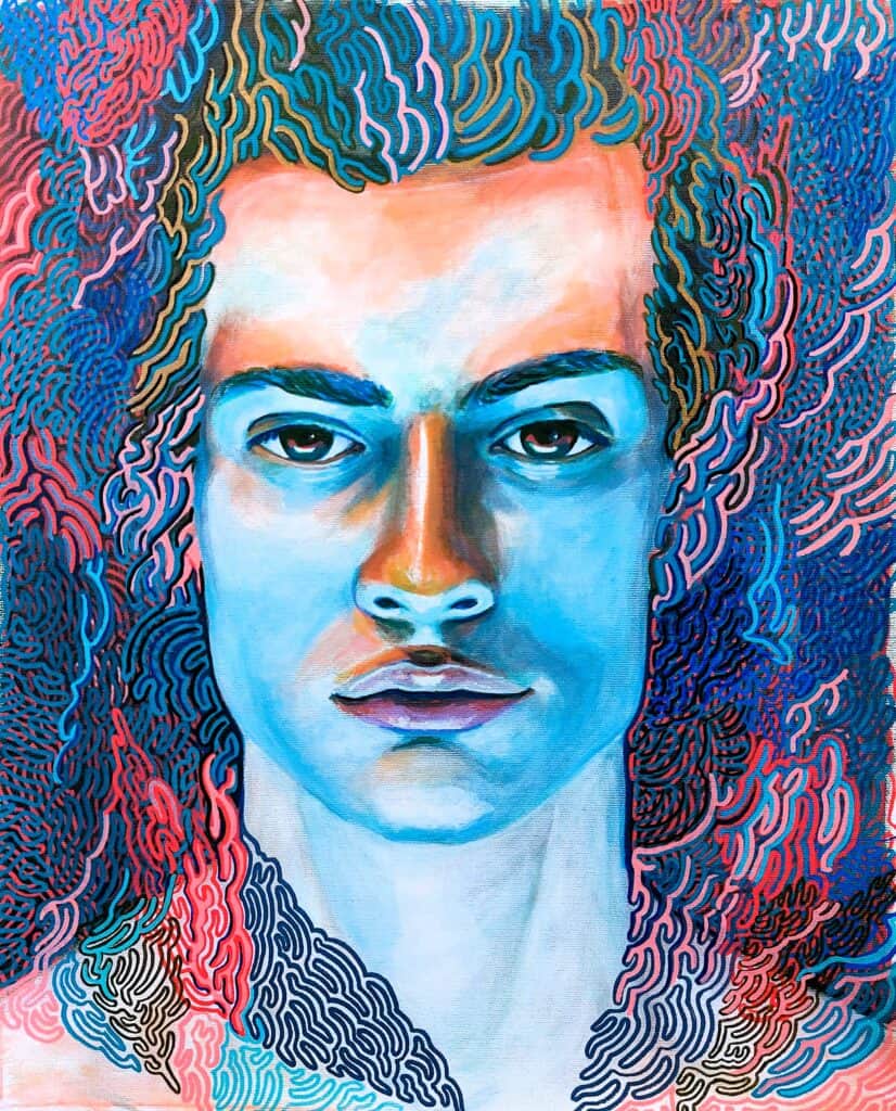 Το χαρακτηριστικό οργανικό σχέδιο του καλλιτέχνη – που θυμίζει δακτυλικά αποτυπώματα, χάρτες ποταμών ή δομές κοραλλιών – έχει εξελιχθεί, αποτελώντας ένα βασικό στοιχείο της σύνθεσης. Αυτή η μοναδική, προσωπική οπτική υπογραφή δεν είναι απλώς διακόσμηση, αλλά αναπόσπαστο μέρος της αφήγησης. Μέσα από την επίστρωση των χρωμάτων και των γραμμών, ο καλλιτέχνης χτίζει πορτρέτα που αντλούν από ιστορικά αρχέτυπα για να μιλήσουν για το παρόν.