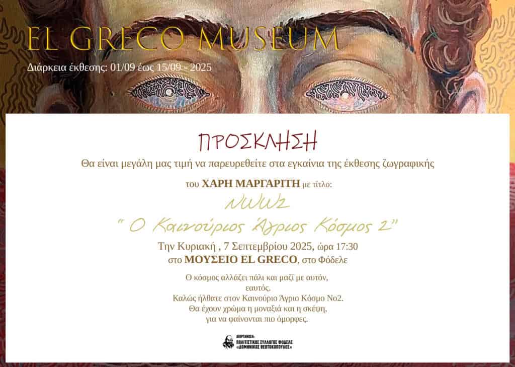 Διάρκεια έκθεσης: 01/09 έως 15/09 – 2025 Την Κυριακή , 7 Σεπτεμβρίου 2025, και ώρα 17:30 στο ΜΟΥΣΕΙΟ EL GRECO, στο Φόδελε