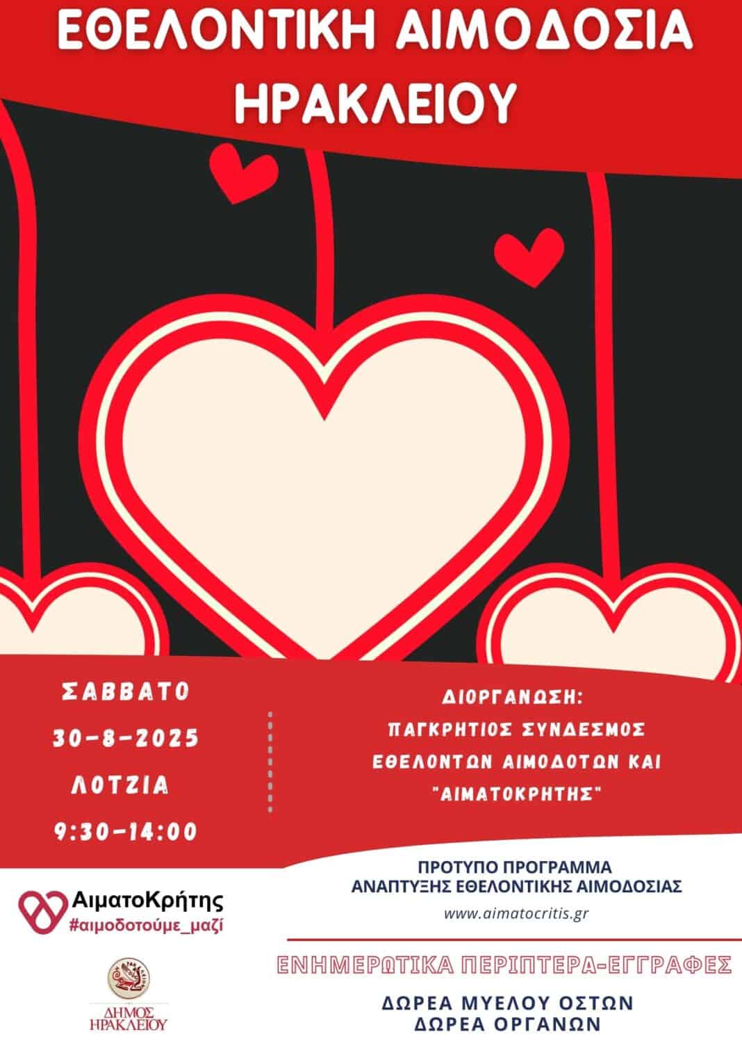 Πρόκειται για μια κοινή προσπάθεια αιμοδοσίας, την οποία διοργανώνει ο Παγκρήτιος Σύνδεσμος Εθελοντών Αιμοδοτών και Δωρητών Οργάνων Σώματος «Αιματοκρήτης» με τη στήριξη του Δήμου Ηρακλείου.
