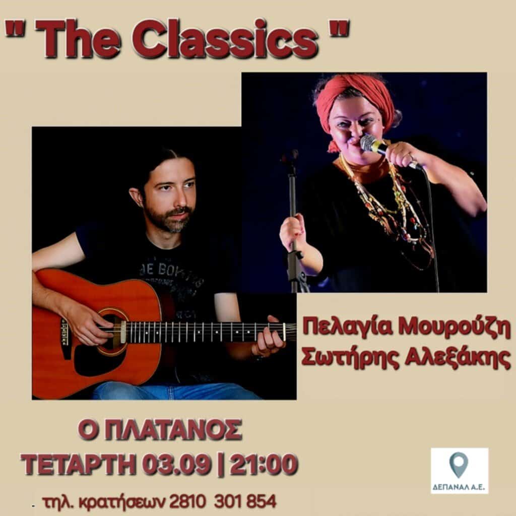Την Τετάρτη 3 Σεπτεμβρίου, στις 21:00, στο Café – Restaurant «Πλάτανος», η Πελαγία Μουρούζη (φωνή) και ο Σωτήρης Αλεξάκης (κιθάρα) θα σκορπίσουν νότες όμορφων κλασσικών και αγαπημένων κομματιών με τίτλο «The Classics».