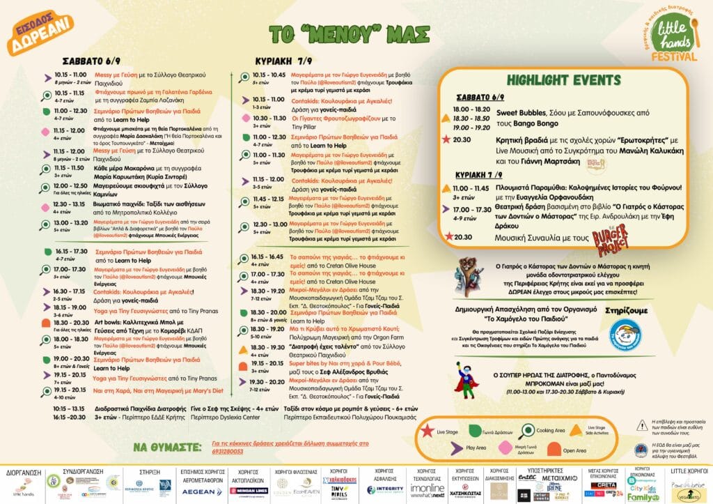 Το 2ο Φεστιβάλ Βρεφικής & Παιδικής Διατροφής «Little Hands Festival» επιστρέφει και πραγματοποιείται το Σαββατοκύριακο 6 και 7 Σεπτεμβρίου στον περιβάλλοντα χώρο του Παγκρητίου Σταδίου. Με ώρες λειτουργίας από τις 10:00 έως τις 13:30 και από τις 16:00 έως τις 21:30 και ελεύθερη είσοδο για όλους, οι εκδηλώσεις του Φεστιβάλ υπόσχονται δύο ημέρες γεμάτες παιχνίδι, μουσική, γνώση και αξέχαστες εμπειρίες για όλη την οικογένεια.
