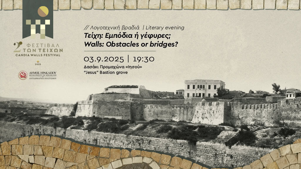 Στο Δασάκι του Προμαχώνα Ιησού στις 19:30, θα πραγματοποιηθεί λογοτεχνική βραδιά με τίτλο «Τείχη: Εμπόδια ή γέφυρες;», μια ποιητική και θεατρική συμπερίληψη αποσπασμάτων με θέμα τα τείχη από την Ένωση Φιλολόγων Νομού Ηρακλείου.