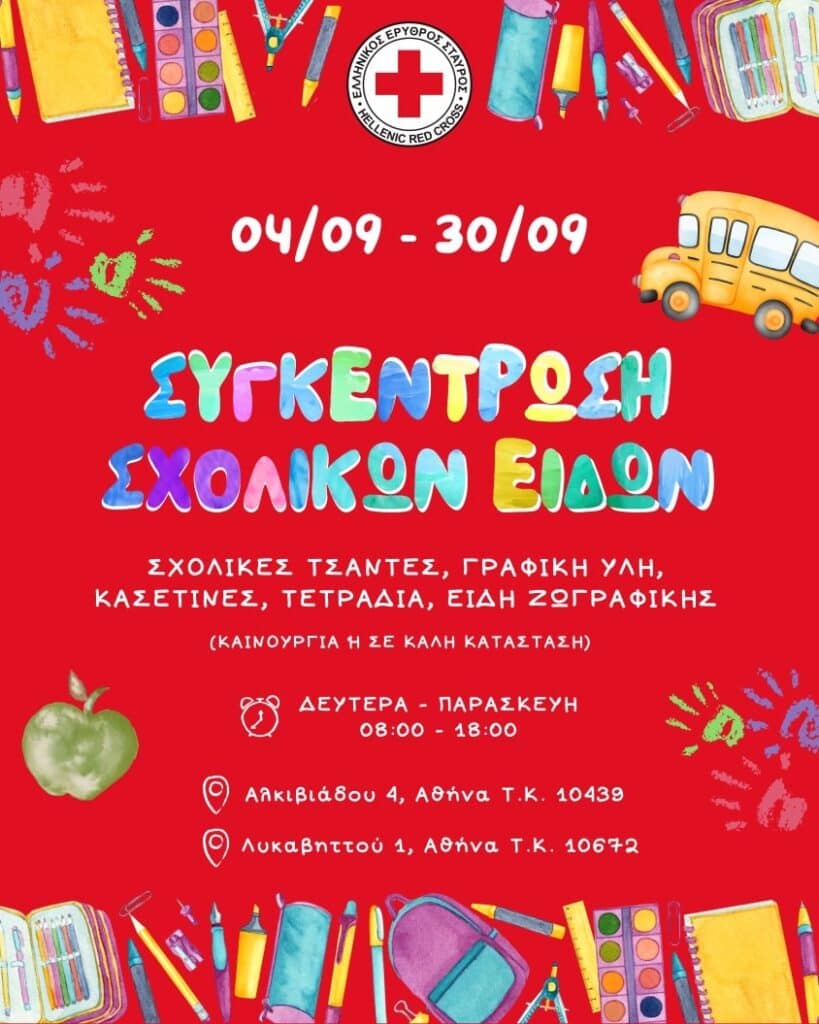 Ο Τομέας Κοινωνικής Πρόνοιας του Ελληνικού Ερυθρού Σταυρού, στο πλαίσιο παροχής ολιστικής υποστήριξης ευάλωτων οικογενειών και ενόψει της έναρξης της σχολικής χρονιάς, απευθύνει ανοιχτό κάλεσμα για τη συγκέντρωση σχολικών ειδών, με σκοπό την ανακούφιση οικογενειών με παιδιά που φοιτούν στο δημόσιο σχολείο.